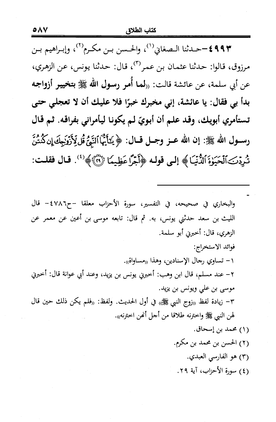 4993 - حدثنا الصغاني (¬1)، والحسن بن مكرم (¬2)، وإبراهيم بن مرزوق، قالوا: حدثنا عثمان بن عمر (¬3)، قال: حدثنا يونس، عن الزهري، عن أبي سلمة، عن عائشة قالت: "لما أُمر رسول الله -صلى الله عليه وسلم- بتخيير أزواجه بدأ بي فقال: يا عائشة، إني مخبرك خبرًا فلا عليك أن لا تعجلي حتى تستأمري أبويك، وقد علم أن أبويّ لم يكونا ليأمراني بفراقه. ثم قال رسول الله -صلى الله عليه وسلم-: إن الله عز وجل قال: {يَاأَيُّهَا النَّبِيُّ قُلْ لِأَزْوَاجِكَ إِنْ كُنْتُنَّ تُرِدْنَ الْحَيَاةَ الدُّنْيَا} إلى قوله {أَجْرًا عَظِيمًا (29)} (¬4). قال فقلت: