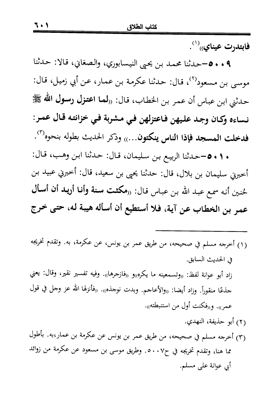 5009 - حدثنا محمد بن يحيى النيسابوري، والصغاني، قالا: حدثنا موسى بن مسعود (¬1)، قال: حدثنا عكرمة بن عمار، عن أبي زميل، قال: حدثني ابن عباس أن عمر بن الخطاب، قال: "لما اعتزل رسول الله -صلى الله عليه وسلم- نساءه وكان وجد عليهن فاعتزلهن في مشربة في خزانته قال عمر: فدخلت المسجد فإذا الناس ينكتون ... " وذكر الحديث بطوله بنحوه (¬2).