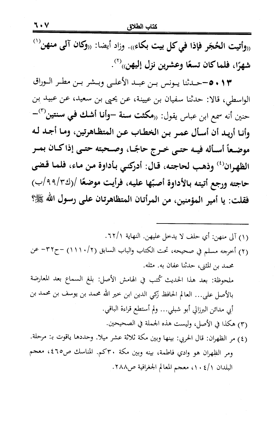 5013 - حدثنا يونس بن عبد الأعلى وبشر بن مطر الوراق الواسطي، قالا: حدثنا سفيان بن عيينة، عن يحيى بن سعيد، عن عبيد بن حنين أنه سمع ابن عباس يقول: "مكثت سنة -وأنا أشك في سنتين (¬1) - وأنا أريد أن أسأل عمر بن الخطاب عن المتظاهرتين، وما أجد له موضعًا أسأله فيه حتى خرج حاجًّا، وصحبته حتى إذا كان بمر الظهران (¬2) وذهب لحاجته، قال: أدركني بأداوة من ماء، فلما قضى حاجته ورجع أتيته بالأداوة أصبّها عليه، فرأيت موضعًا فقلت: يا أمير المؤمنين، من المرأتان المتظاهرتان على رسول الله -صلى الله عليه وسلم-؟