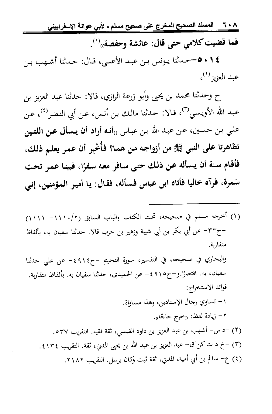 5014 - حدثنا يونس بن عبد الأعلى، قال: حدثنا أشهب بن عبد العزيز (¬1)، ح وحدثنا محمد بن يحيى وأبو زرعة الرازي، قالا: حدثنا عبد العزيز بن عبد الله الأويسي (¬2)، قالا: حدثنا مالك بن أنس، عن أبي النضر (¬3)، عن علي بن حسين، عن عبد الله بن عباس "أنه أراد أن يسأل عن اللتين تظاهرتا على النبي -صلى الله عليه وسلم- من أزواجه من هما؟ فأُخْبِر أن عمر يعلم ذلك، فأقام سنة أن يسأله عن ذلك حتى سافر معه سفرًا، فبينا عمر تحت سَمرة، فرآه خاليا فأتاه ابن عباس فسأله، فقال: يا أمير المؤمنين، إني