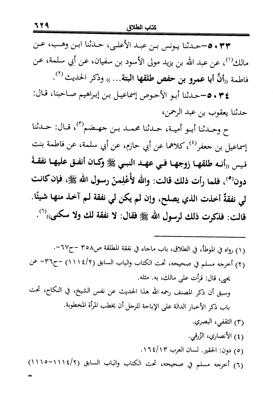 5033 - حدثنا يونس بن عبد الأعلى، حدثنا ابن وهب، عن مالك (¬1)، عن عبد الله بن يزيد مولى الأسود بن سفيان، عن أبي سلمة، عن فاطمة "أنَّ أبا عمرو بن حفص طلقها البتة ... " وذكر الحديث (¬2).