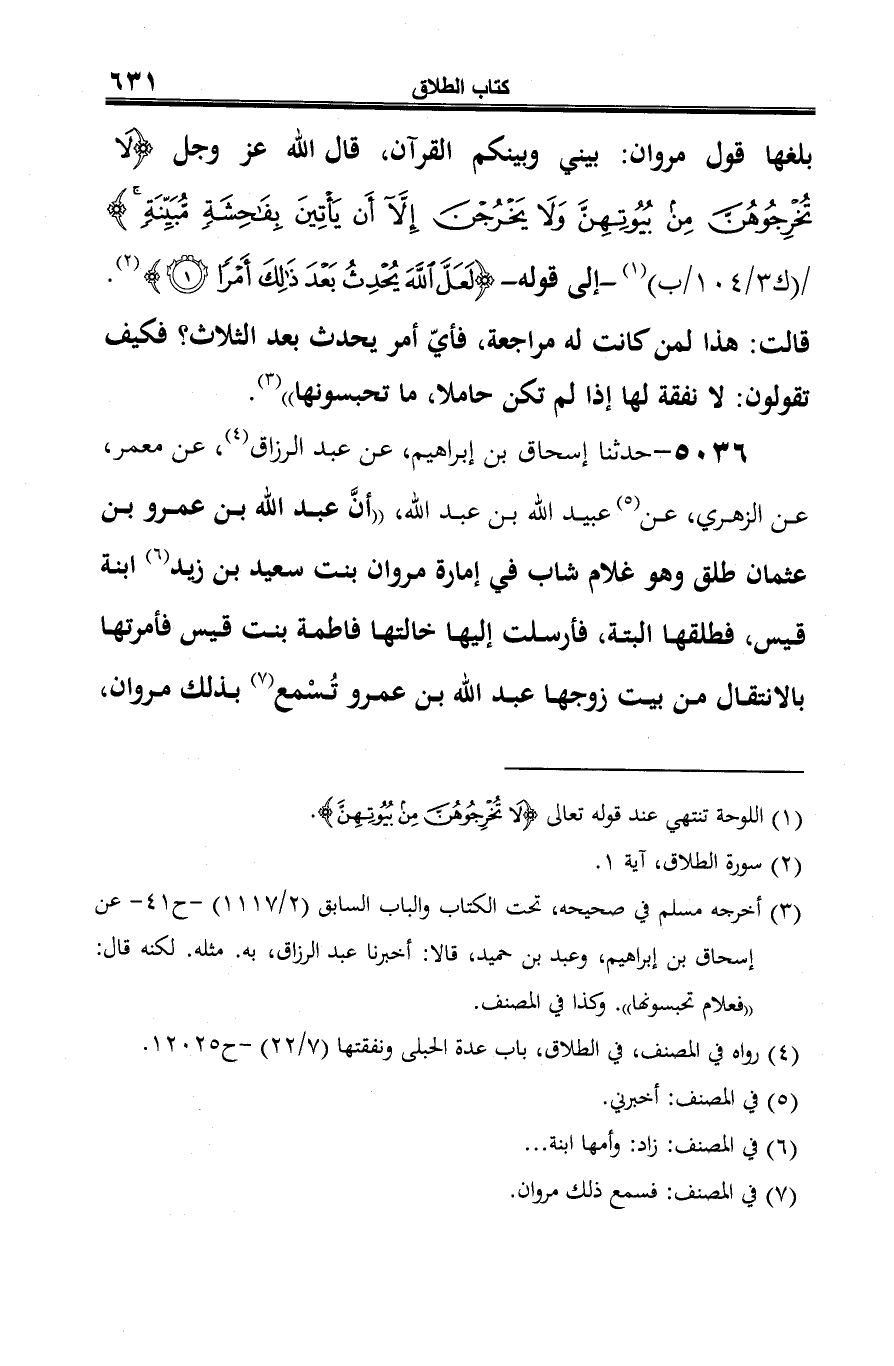 5036 - حدثنا إسحاق بن إبراهيم، عن عبد الرزاق (¬1)، عن معمر، عن الزهري، عن (¬2) عبيد الله بن عبد الله، "أنَّ عبد الله بن عمرو بن عثمان طلق وهو غلام شاب في إمارة مروان بنت سعيد بن زيد (¬3) ابنة قيس، فطلقها البتة، فأرسلت إليها خالتها فاطمة بنت قيس فأمرتها بالانتقال من بيت زوجها عبد الله بن عمرو تُسمع (¬4) بذلك مروان،