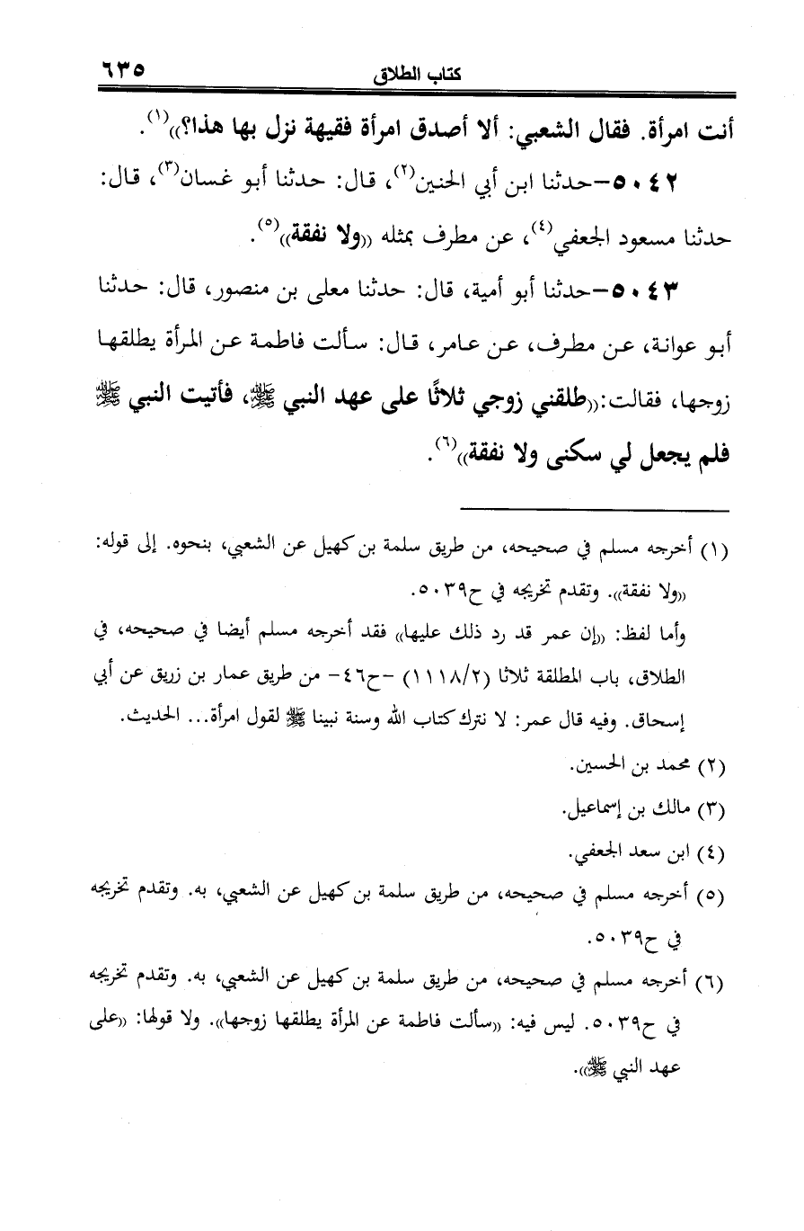 5043 - حدثنا أبو أمية، قال: حدثنا معلى بن منصور، قال: حدثنا أبو عوانة، عن مطرف، عن عامر، قال: سألت فاطمة عن المرأة يطلقها زوجها، فقالت: "طلقني زوجي ثلاثًا على عهد النبي -صلى الله عليه وسلم-، فأتيت النبي -صلى الله عليه وسلم- فلم يجعل لي سكنى ولا نفقة" (¬1).