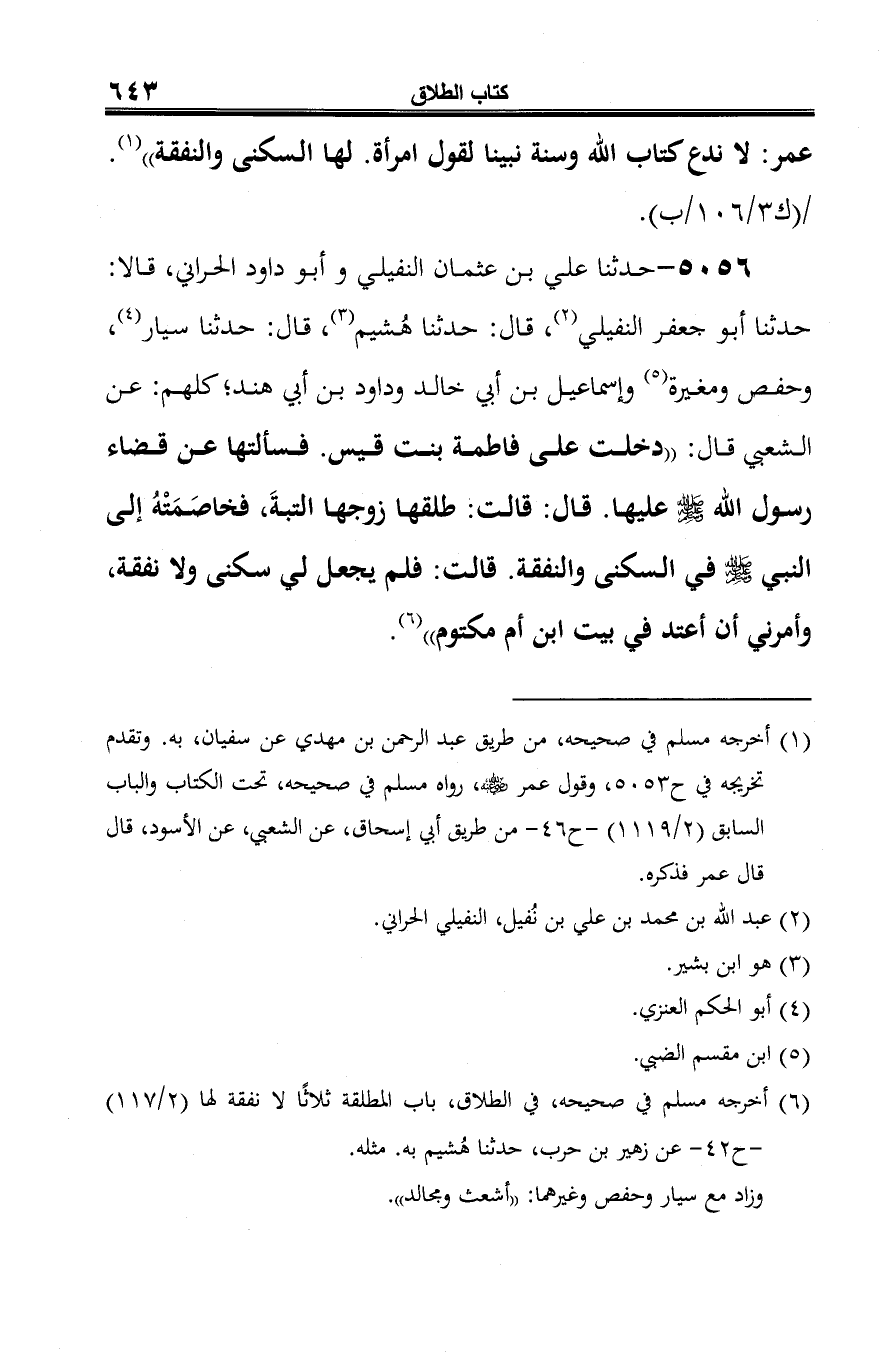 5056 - حدثنا علي بن عثمان النفيلي وأبو داود الحراني، قالا: حدثنا أبو جعفر النفيلي (¬1)، قال: حدثنا هُشيم (¬2)، قال: حدثنا سيار (¬3)، وحفص ومغيرة (¬4) وإسماعيل بن أبي خالد وداود بن أبي هند؛ كلهم: عن الشعبي قال: "دخلت على فاطمة بنت قيس. فسألتها عن قضاء رسول الله -صلى الله عليه وسلم- عليها. قال: قالت: طلقها زوجها التبةَ، فخاصَمَتْهُ إلى النبي -صلى الله عليه وسلم- في السكنى والنفقة. قالت: فلم يجعل لي سكنى ولا نفقة، وأمرني أن أعتد في بيت ابن أم مكتوم" (¬5).