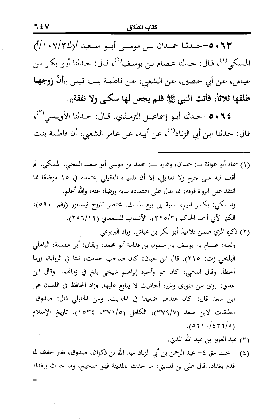 5063 - حدثنا حمدان بن موسى أبو سعيد المسكي (¬1)، قال: حدثنا عصام بن يوسف (¬2)، قال: حدثنا أبو بكر بن عياش، عن أبي حصين، عن الشعبي، عن فاطمة بنت قيس "أنّ زوجها طلقها ثلاثًا، فأتت النبي -صلى الله عليه وسلم- فلم يجعل لها سكنى ولا نفقة".