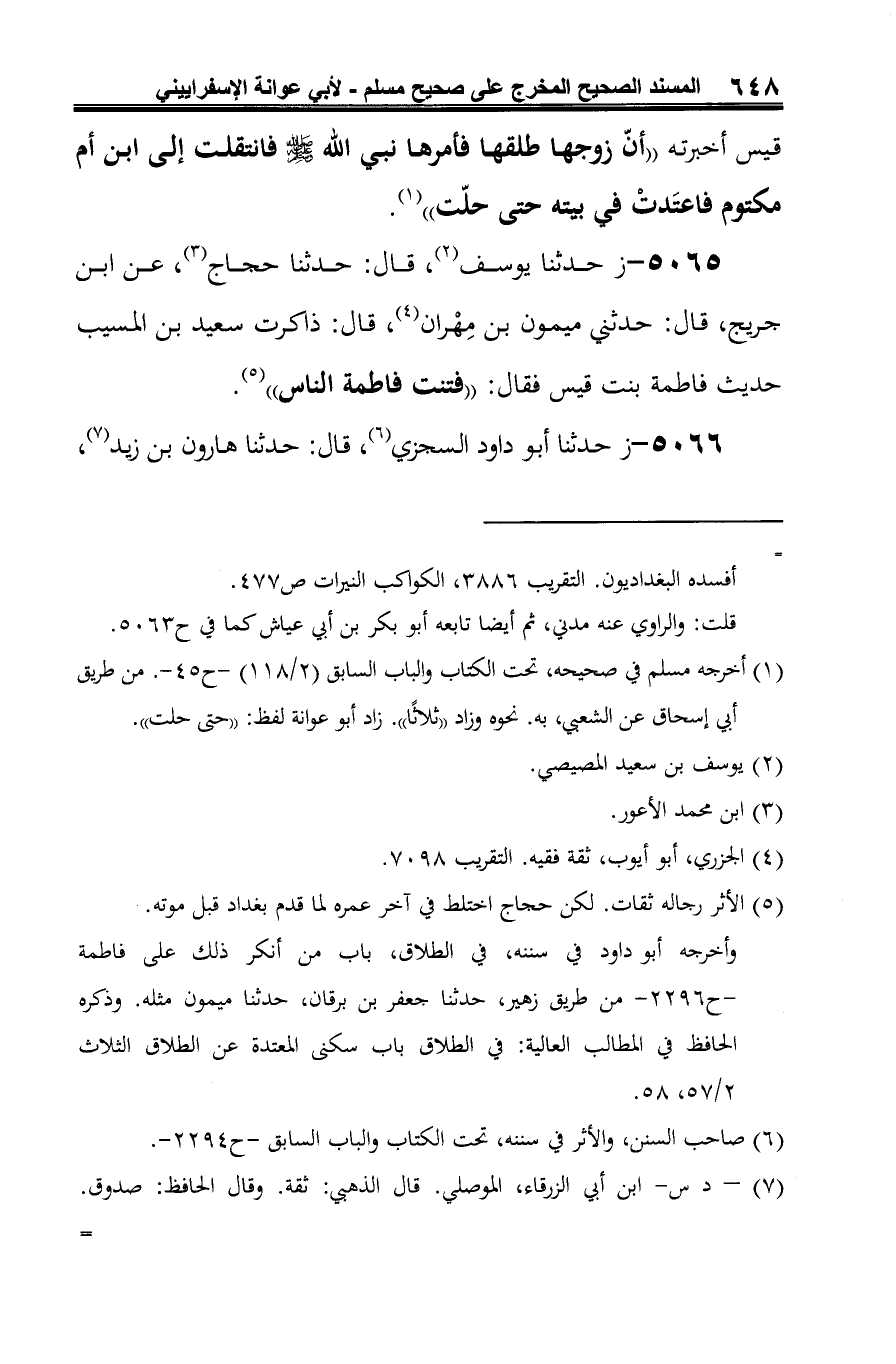 5065 - ز حدثنا يوسف (¬1)، قال: حدثنا حجاج (¬2)، عن ابن جريج، قال: حدثني ميمون بن مِهْران (¬3)، قال: ذاكرت سعيد بن المسيب حديث فاطمة بنت قيس فقال: "فتنت فاطمة الناس" (¬4).