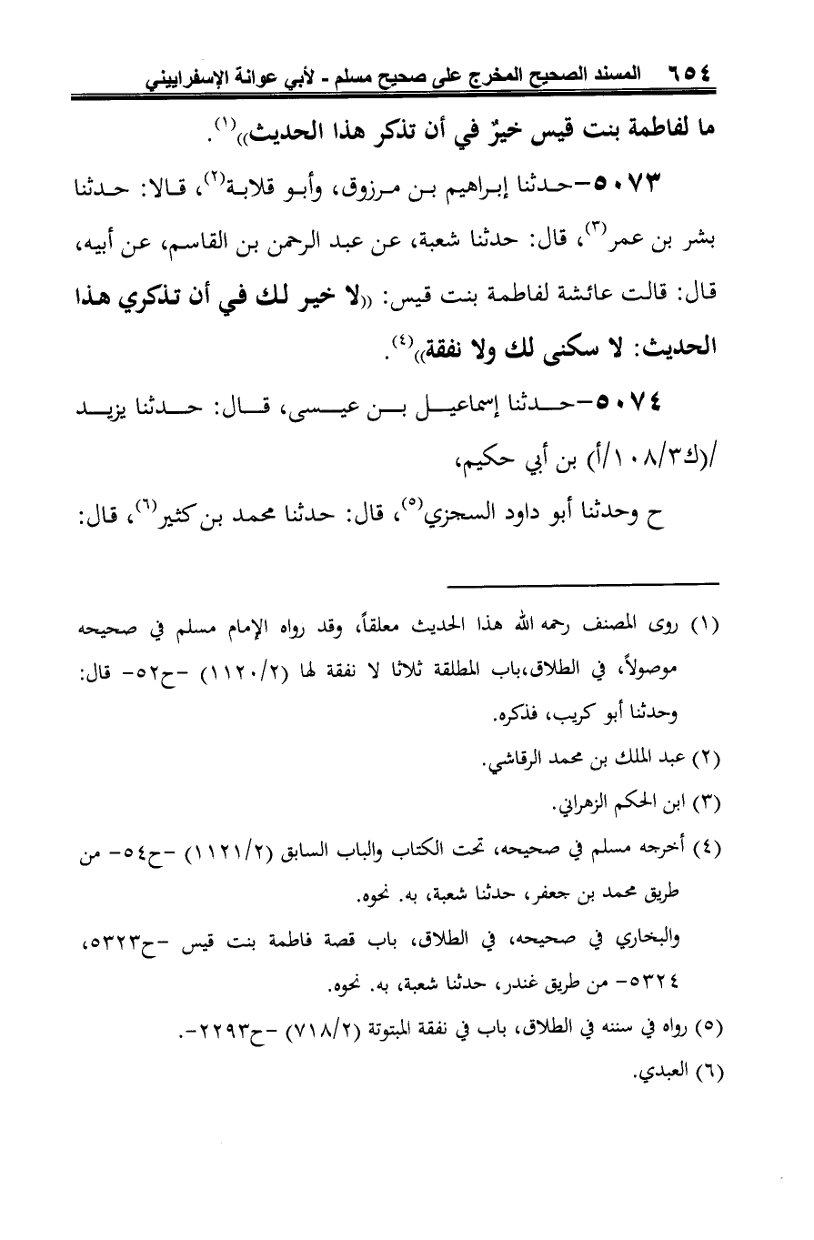5073 - حدثنا إبراهيم بن مرزوق، وأبو قلابة (¬1)، قالا: حدثنا بشر بن عمر (¬2)، قال: حدثنا شعبة، عن عبد الرحمن بن القاسم، عن أبيه، قال: قالت عائشة لفاطمة بنت قيس: "لا خير لك في أن تذكري هذا الحديث: لا سكنى لك ولا نفقة" (¬3).