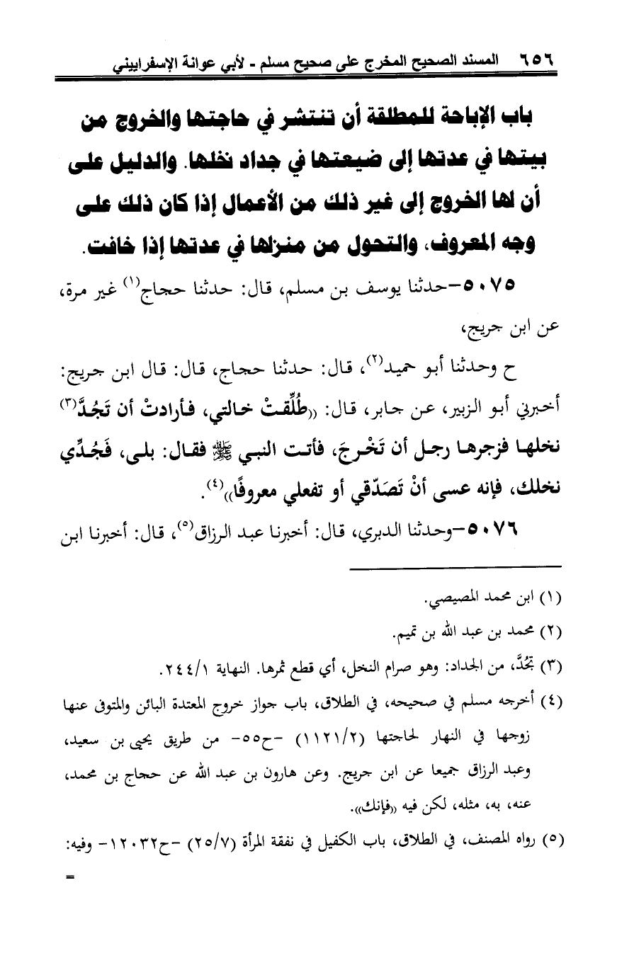 ح وحدثنا أبو حميد (¬2)، قال: حدثنا حجاج، قال: قال ابن جريج: أخبرني أبو الزبير، عن جابر، قال: "طُلِّقتْ خالتي، فأرادتْ أن تَجُدَّ (¬3) نخلها فزجرها رجل أن تَخْرجَ، فأتت النبي -صلى الله عليه وسلم- فقال: بلى، فَجُدِّي نخلك، فإنه عسى أنْ تَصَدّقي أو تفعلي معروفًا" (¬4).