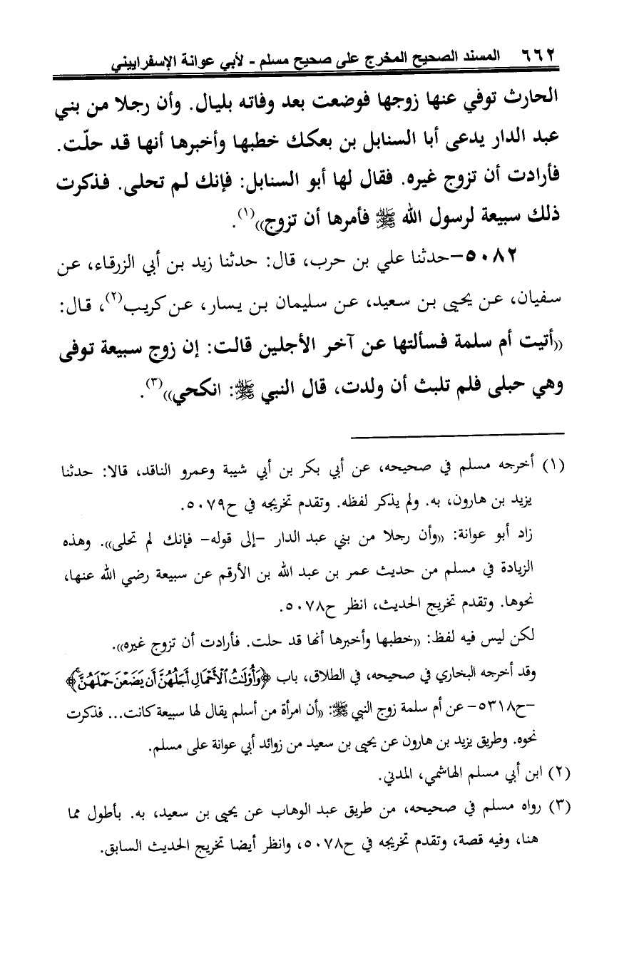 5082 - حدثنا علي بن حرب، قال: حدثنا زيد بن أبي الزرقاء، عن سفيان، عن يحيى بن سعيد، عن سليمان بن يسار، عن كريب (¬1)، قال: "أتيت أم سلمة فسألتها عن آخر الأجلين قالت: إن زوج سبيعة توفى وهي حبلى فلم تلبث أن ولدت، قال النبي -صلى الله عليه وسلم-: انكحي" (¬2).