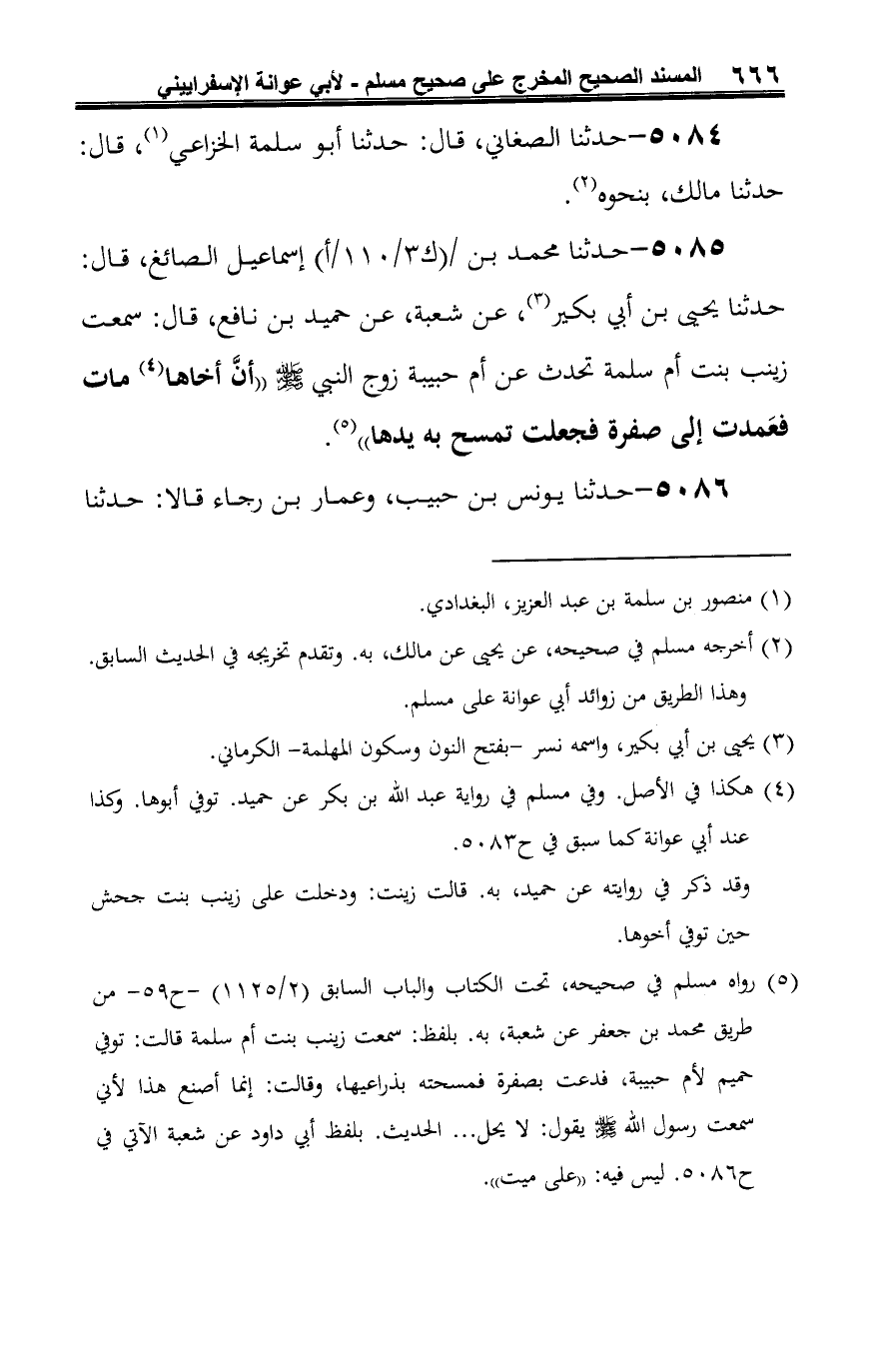 5085 - حدثنا محمد بن إسماعيل الصائغ، قال: حدثنا يحيى بن أبي بكير (¬1)، عن شعبة، عن حميد بن نافع، قال: سمعت زينب بنت أم سلمة تحدث عن أم حبيبة زوج النبي -صلى الله عليه وسلم- "أنَّ أخاها (¬2) مات فعَمدت إلى صفرة فجعلت تمسح به يدها" (¬3).