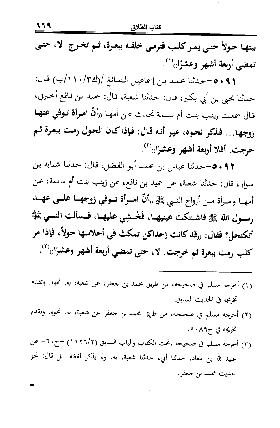 5091 - حدثنا محمد بن إسماعيل الصائغ قال: حدثنا يحيى بن أبي بكير، قال: حدثنا شعبة، قال: حميد بن نافع أخبرني، قال سمعت زينب بنت أم سلمة تحدث عن أمها "أنّ امرأة توفي عنها زوجها ... فذكر نحوه، غير أنه قال: فإذا كان الحول رمت ببعرة ثم خرجت. أفلا أربعة أشهر وعشرًا" (¬1).