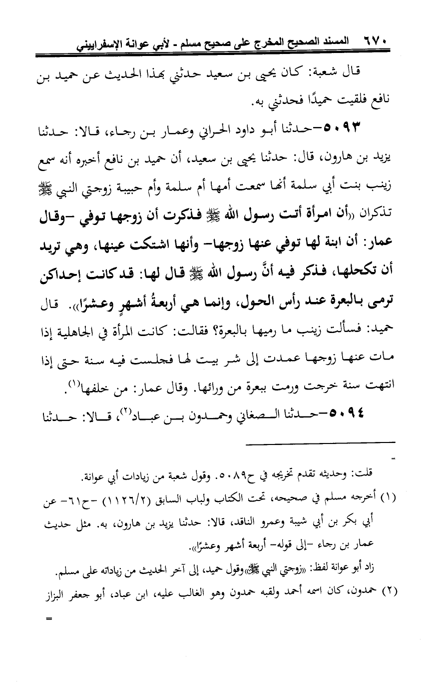5093 - حدثنا أبو داود الحراني وعمار بن رجاء، قالا: حدثنا يزيد بن هارون، قال: حدثنا يحيى بن سعيد، أن حميد بن نافع أخبره أنه سمع زينب بنت أبي سلمة أنها سمعت أمها أم سلمة وأم حبيبة زوجتي النبي -صلى الله عليه وسلم- تذكران "أن امرأة أتت رسول الله -صلى الله عليه وسلم- فذكرت أن زوجها توفي -وقال عمار: أن ابنة لها توفي عنها زوجها- وأنها اشتكت عينها، وهي تريد أن تكحلها، فذكر فيه أنَّ رسول الله -صلى الله عليه وسلم- قال لها: قد كانت إحداكن ترمى بالبعرة عند رأس الحول، وإنما هي أربعةُ أشهرٍ وعشرًا". قال حميد: فسألت زينب ما رميها بالبعرة؟ فقالت: كانت المرأة في الجاهلية إذا مات عنها زوجها عمدت إلى شر بيت لها فجلست فيه سنة حتى إذا انتهت سنة خرجت ورمت ببعرة من ورائها. وقال عمار: من خلفها (¬1).