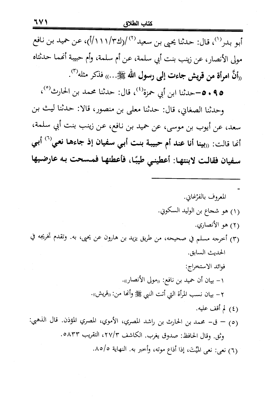 5095 - حدثنا ابن أبي حمزة (¬1)، قال: حدثنا محمد بن الحارث (¬2)، وحدثنا الصغاني، قال: حدثنا معلى بن منصور، قالا: حدثنا ليث بن سعد، عن أيوب بن موسى، عن حميد بن نافع، عن زينب بنت أبي سلمة، أنها قالت: "بينا أنا عند أم حبيبة بنت أبي سفيان إذ جاءها نعي (¬3) أبي سفيان فقالت لابنتها: أعطيني طيبًا، فأعطتها فمسحت به عارضيها