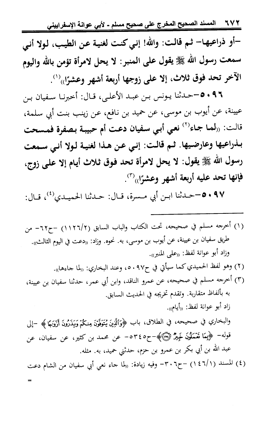 5096 - حدثنا يونس بن عبد الأعلى، قال: أخبرنا سفيان بن عيينة، عن أيوب بن موسى، عن حميد بن نافع، عن زينب بنت أبي سلمة، قالت: "لما جاء (¬1) نعي أبي سفيان دعت أم حبيبة بصفرة فمسحت بذراعيها وعارضيها. ثم قالت: إني عن هذا لغنية لولا أني سمعت رسول الله -صلى الله عليه وسلم- يقول: لا يحل لامرأة تحد فوق ثلاث أيام إلا على زوج، فإنها تحد عليه أربعة أشهر وعشرًا" (¬2).