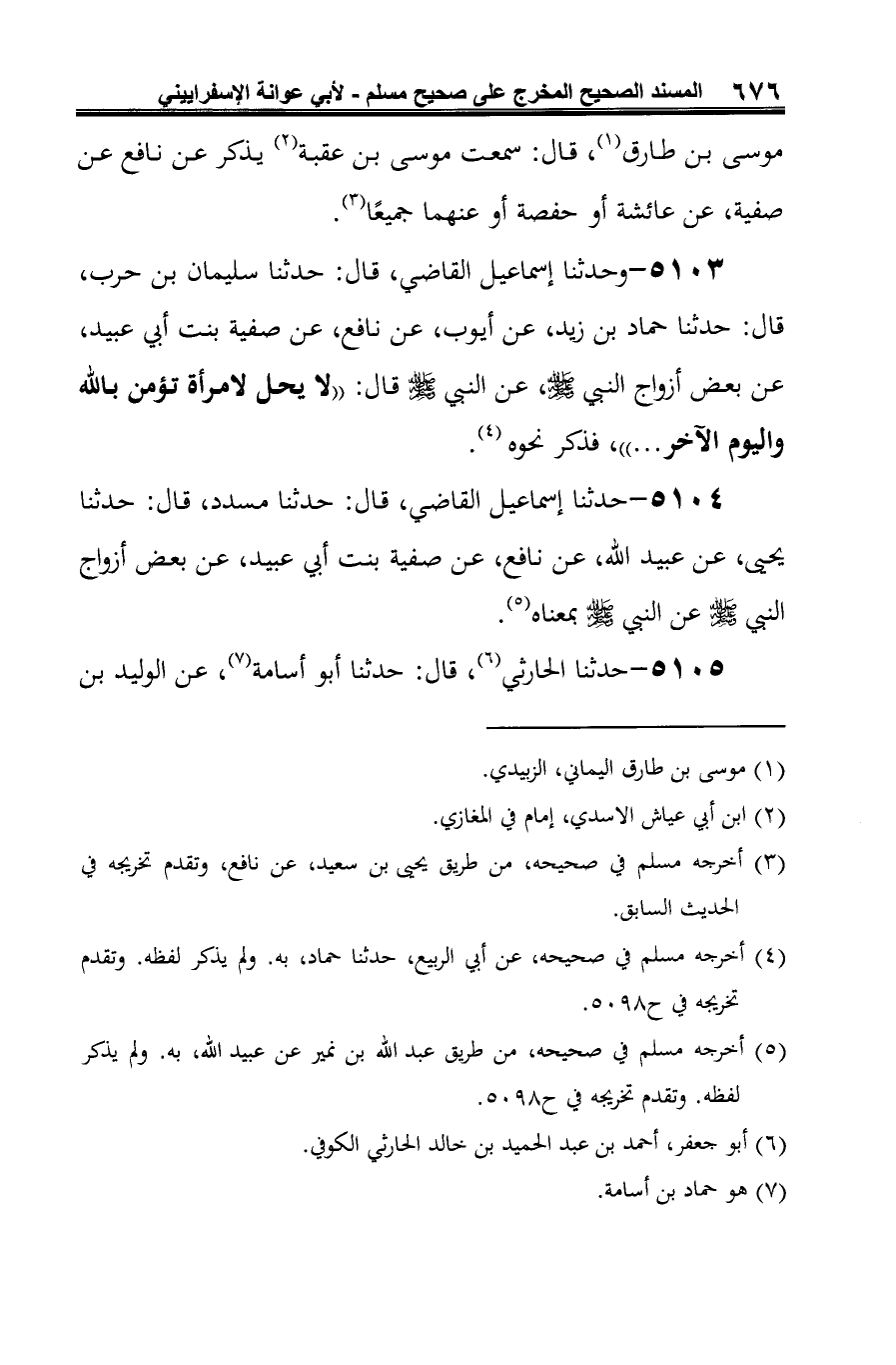 5103 - وحدثنا إسماعيل القاضي، قال: حدثنا سليمان بن حرب، قال: حدثنا حماد بن زيد، عن أيوب، عن نافع، عن صفية بنت أبي عبيد، عن بعض أزواج النبي -صلى الله عليه وسلم-، عن النبي -صلى الله عليه وسلم- قال: "لا يحل لامرأة تؤمن بالله واليوم الآخر ... "، فذكر نحوه (¬1).