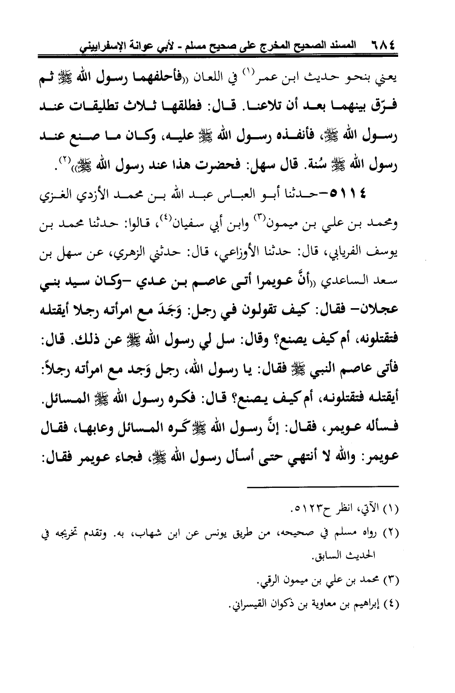 5114 - حدثنا أبو العباس عبد الله بن محمد الأزدي الغزي ومحمد بن علي بن ميمون (¬1) وابن أبي سفيان (¬2)، قالوا: حدثنا محمد بن يوسف الفريابي، قال: حدثنا الأوزاعي، قال: حدثني الزهري، عن سهل بن سعد الساعدي "أنَّ عويمرا أتى عاصم بن عدي -وكان سيد بني عجلان- فقال: كيف تقولون في رجل: وَجَدَ مع امرأته رجلا أيقتله فتقتلونه، أم كيف يصنع؟ وقال: سل لي رسول الله -صلى الله عليه وسلم- عن ذلك. قال: فأتى عاصم النبي -صلى الله عليه وسلم- فقال: يا رسول الله، رجل وَجد مع امرأته رجلًا: أيقتله فتقتلونه، أم كيف يصنع؟ قال: فكره رسول الله -صلى الله عليه وسلم- المسائل. فسأله عويمر، فقال: إنَّ رسول الله -صلى الله عليه وسلم- كَره المسائل وعابها، فقال عويمر: والله لا أنتهي حتى أسأل رسول الله -صلى الله عليه وسلم-، فجاء عويمر فقال: