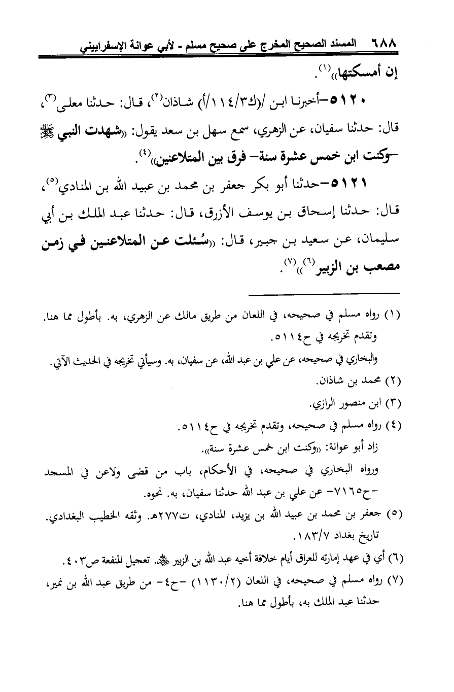 5120 - أخبرنا ابن شاذان (¬1)، قال: حدثنا معلى (¬2)، قال: حدثنا سفيان، عن الزهري، سمع سهل بن سعد يقول: "شهدت النبي -صلى الله عليه وسلم-وكنت ابن خمس عشرة سنة- فرق بين المتلاعنين" (¬3).
