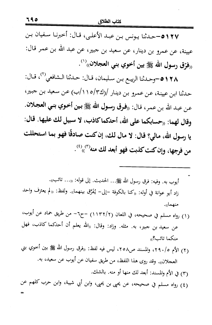 5127 - حدثنا يونس بن عبد الأعلى، قال: أخبرنا سفيان بن عيينة، عن عمرو بن دينار، عن سعيد بن جبير، عن عبد الله بن عمر قال: "فرّق رسول الله -صلى الله عليه وسلم- بين أخوي بني العجلان" (¬1).