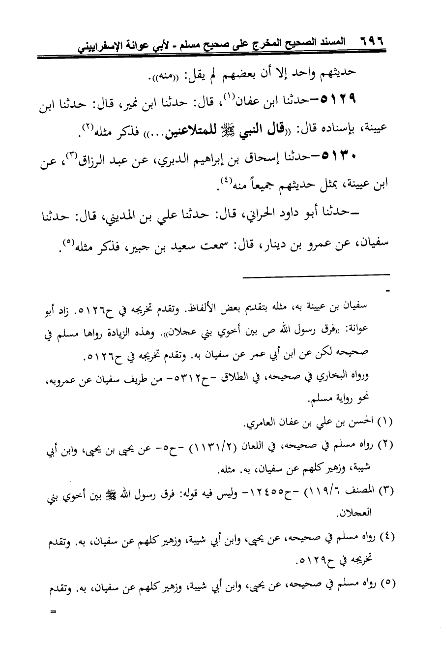 5129 - حدثنا ابن عفان (¬1)، قال: حدثنا ابن نمير، قال: حدثنا ابن عيينة، بإسناده قال: "قال النبي -صلى الله عليه وسلم- للمتلاعنين ... " فذكر مثله (¬2).
