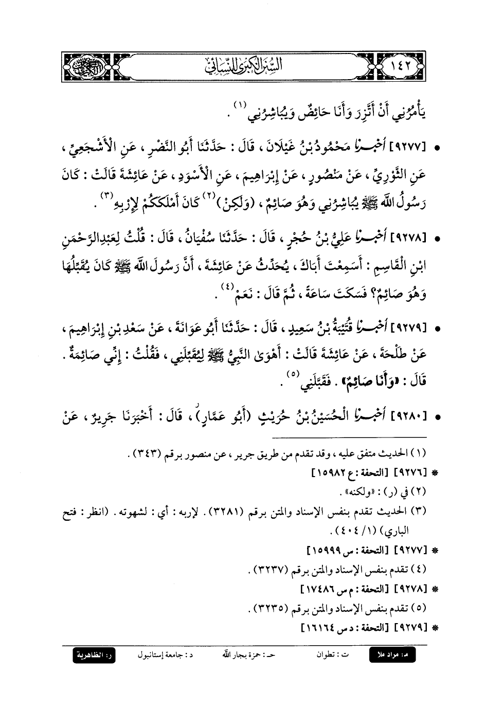 9276- أَخبَرنا مَحْمُودُ بنُ غَيْلانَ، قَالَ: حَدثنا وَكِيعٌ، قَالَ: حَدثنا سُفيانُ، عَن مَنصُورٍ، عَن إِبْرَاهِيمَ، عَنِ الأَسْوَدِ، عَن عَائِشَةَ قَالَتْ: كَانَ رَسُولُ اللهِ صَلى الله عَلَيهِ وسَلم يَأْمُرُنِي أَنْ أَتَّزِرَ وَأنا حَائِضٌ وَيُبَاشِرُنِي.