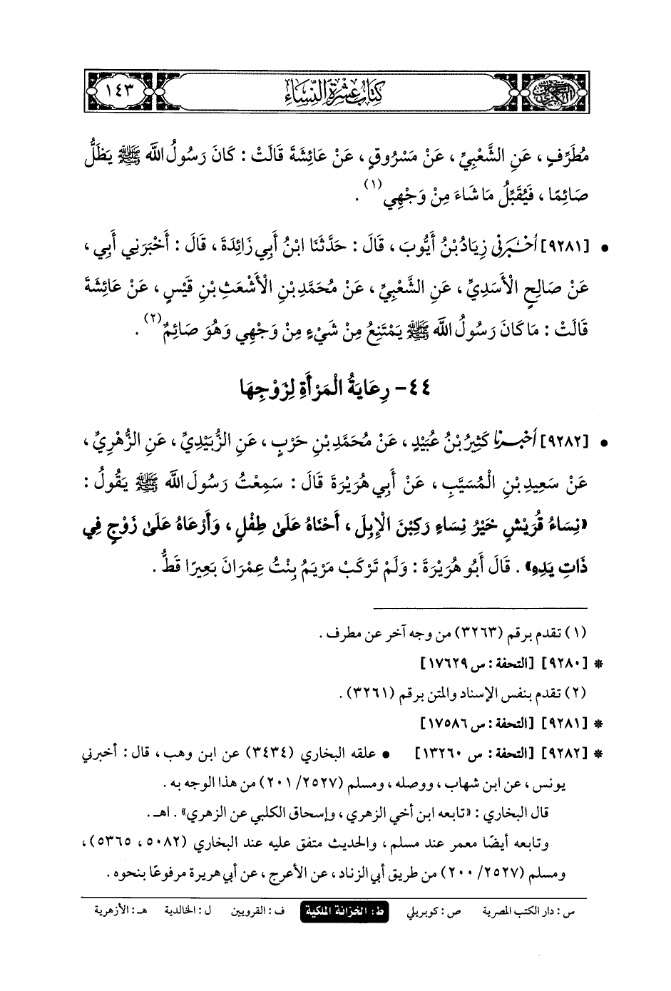 9281- أَخْبَرَنِي زِيَادُ بنُ أَيوبَ، قَالَ: حَدثنا ابنُ أَبي زَائِدَةَ، قَالَ: أَخْبَرَنِي أَبي، عَن صَالِحٍ الأَسَدِيِّ، عَنِ الشَّعْبِيِّ، عَن مُحَمدِ بنِ الأَشْعَثِ بنِ قَيْسٍ، عَن عَائِشَةَ قَالَتْ: مَا كَانَ رَسُولُ اللهِ صَلى الله عَلَيهِ وسَلم يَمْتَنِعُ مِنْ شَيْءٍ مِنْ وَجْهِي وَهُوَ صَائِمٌ.