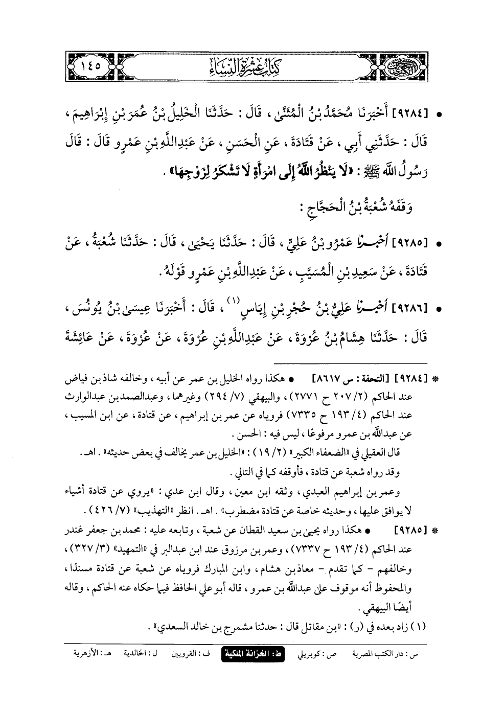 9285- أَخبَرنا عَمْرُو بنُ عَليٍّ، قَالَ: حَدثنا يَحيَى، قَالَ: حَدثنا شُعبَةُ، عَن قَتَادَةَ، عَن سَعِيدِ بنِ المُسَيَّبِ، عَن عَبدِ اللهِ بنِ عَمْرٍو ... قَوْلِهِ.