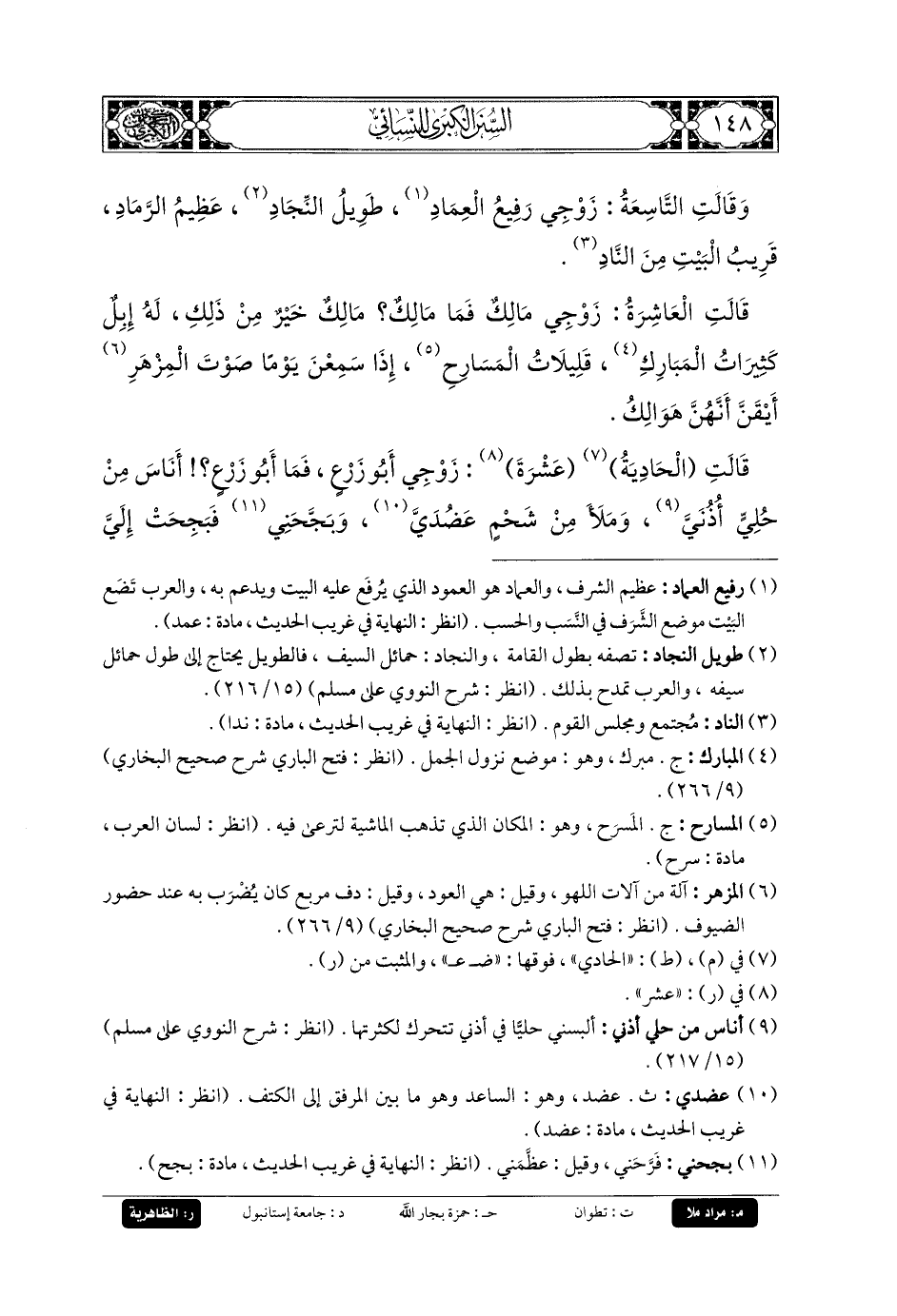 9286- أَخبَرنا عَليُّ بنُ حُجْرِ بنِ إِيَاسٍ، قَالَ: أَخبَرنا عِيسَى بنُ يُونُسَ، قَالَ: حَدثنا هِشَامُ بنُ عُرْوَةَ، عَن عَبدِ اللهِ بنِ عُرْوَةَ، عَن عُرْوَةَ، عَن عَائِشَةَ قَالَتْ: جَلَسَ إِحْدَى عَشْرَةَ امْرَأَةً، فَتَعَاهَدْنَ وَتَعَاقَدْنَ أَنْ لا يَكْتُمْنَ مِنْ أَخْبَارِ أَزْوَاجِهِنَّ شَيْئًا، قَالَتِ الأُولَى: زَوْجِي لَحْمُ جَمَلٍ غَثٍّ، عَلَى رَأْسِ جَبَلٍ، لا سَهْلٌ فَيُرْتَقَى، وَلا سَمِينٌ فَيُنْتَقَلُ، قَالَتِ الثَّانِيَةُ: زَوْجِي لا أَبُثُّ خَبَرَهُ، إِنِّي أَخَافُ أَنْ لا أَذَرَهُ، وإِنْ أَذْكُرْهُ أَذْكُرْ عُجَرَهُ وَبُجَرَهُ، قَالَتِ الثَّالِثَةُ: زَوْجِيَ العَشَنَّقُ، إِنْ أَنْطِقْ أُطَلَّقْ، وَإِنْ أَسْكُتْ أُعَلَّقْ، قَالَتِ الرَّابِعَةُ: زَوْجِي كَلَيْلِ تِهَامَةَ، لا حَرٌّ، وَلا قُرٌّ، وَلا مَخَافَةَ، وَلا سَآمَةَ، قَالَتِ الخَامِسَةُ: زَوْجِي إِنْ دَخَلَ فَهِدَ، وَإِنْ خَرَجَ أَسِدَ، وَلا يَسْأَلُ عَمَّا عَهِدَ، قَالَتِ السَّادِسَةُ: زَوْجِي إِنْ أَكَلَ لَفَّ، وَإِنْ شَرِبَ اشْتَفَّ، وَإِنِ اضْطَجَعَ التَفَّ، وَلا يُولِجُ الكَفَّ، لِيَعْلَمَ البَثَّ، قَالَتِ السَّابِعَةُ: زَوْجِي عَيَايَاءُ أَوْ غَيَايَاءُ، طَبَاقَاءُ، كُلُّ دَاءٍ لَهُ دَاءٌ، شَجَّكِ، أَوْ فَلَّكِ، أَوْ جَمَعَ كُلاًّ لَكِ، وَقَالَتِ الثَّامِنَةُ: زَوْجِيَ المَسُّ مَسُّ أَرْنَبٍ، وَالرِّيحُ رِيحُ زَرْنَبٍ، وَقَالَتِ التَّاسِعَةُ: زَوْجِي رَفِيعُ العِمَادِ، طَوِيلُ النِّجَادِ، عَظِيمُ الرَّمَادِ، قَرِيبُ البَيْتِ مِنِ النَّادِ، قَالَتِ العَاشِرَةُ: زَوْجِي مَالِكٌ، فَمَا مَالِكٌ مَالِكٌ خَيْرٌ مِنْ ذَلِكِ، لَهُ إِبِلٌ كَثِيرَاتُ المَبَارِكِ، قَلِيلاتُ المَسَارِحِ،