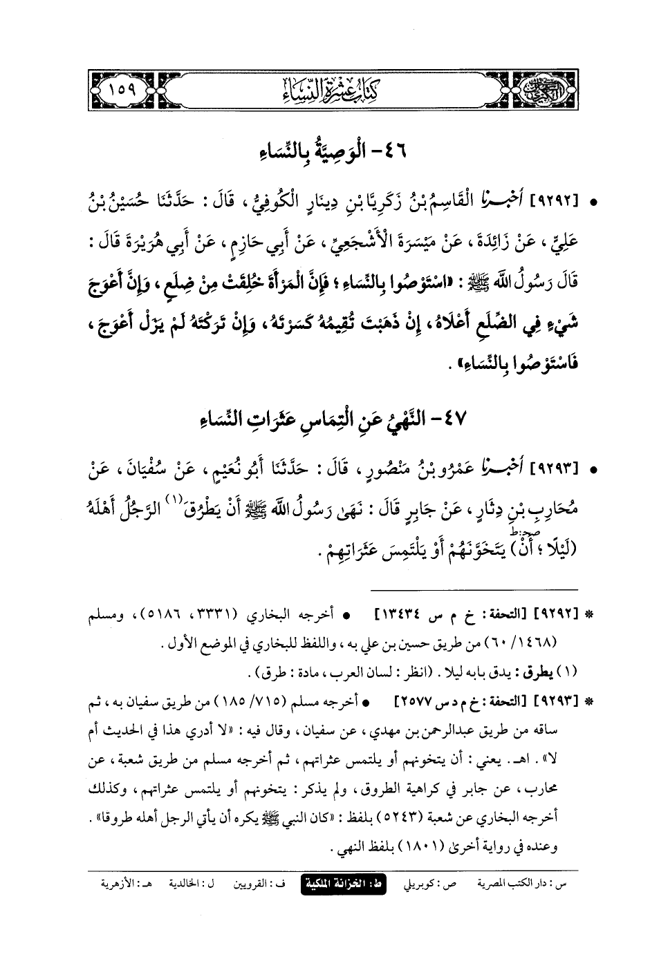9292- أَخبَرنا القَاسِمُ بنُ زَكَرِيَّا بنِ دِينَارٍ الكُوفِيُّ، قَالَ: حَدثنا حُسَيْنُ بنُ عَليٍّ، عَن زَائِدَةَ، عَن مَيْسَرَةَ الأَشْجَعِيِّ، عَن أَبي حَازِمٍ، عَن أَبي هُرَيْرَةَ قَالَ: قَالَ رَسُولُ اللهِ صَلى الله عَلَيهِ وسَلم: اسْتَوْصُوا بِالنِّسَاءِ، فَإِنَّ المَرْأَةَ خُلِقَتْ مِنْ ضِلَعٍ، وَإِنَّ أَعْوَجَ شَيْءٍ فِي الضِّلَعِ أَعْلاهُ، إِنْ ذَهَبْتَ تُقَيِّمُهُ كَسَرْتَهُ، وَإِنْ تَرَكْتَهُ لَمْ يَزَلْ أَعْوَجَ، فَاسْتَوْصُوا بِالنِّسَاءِ.