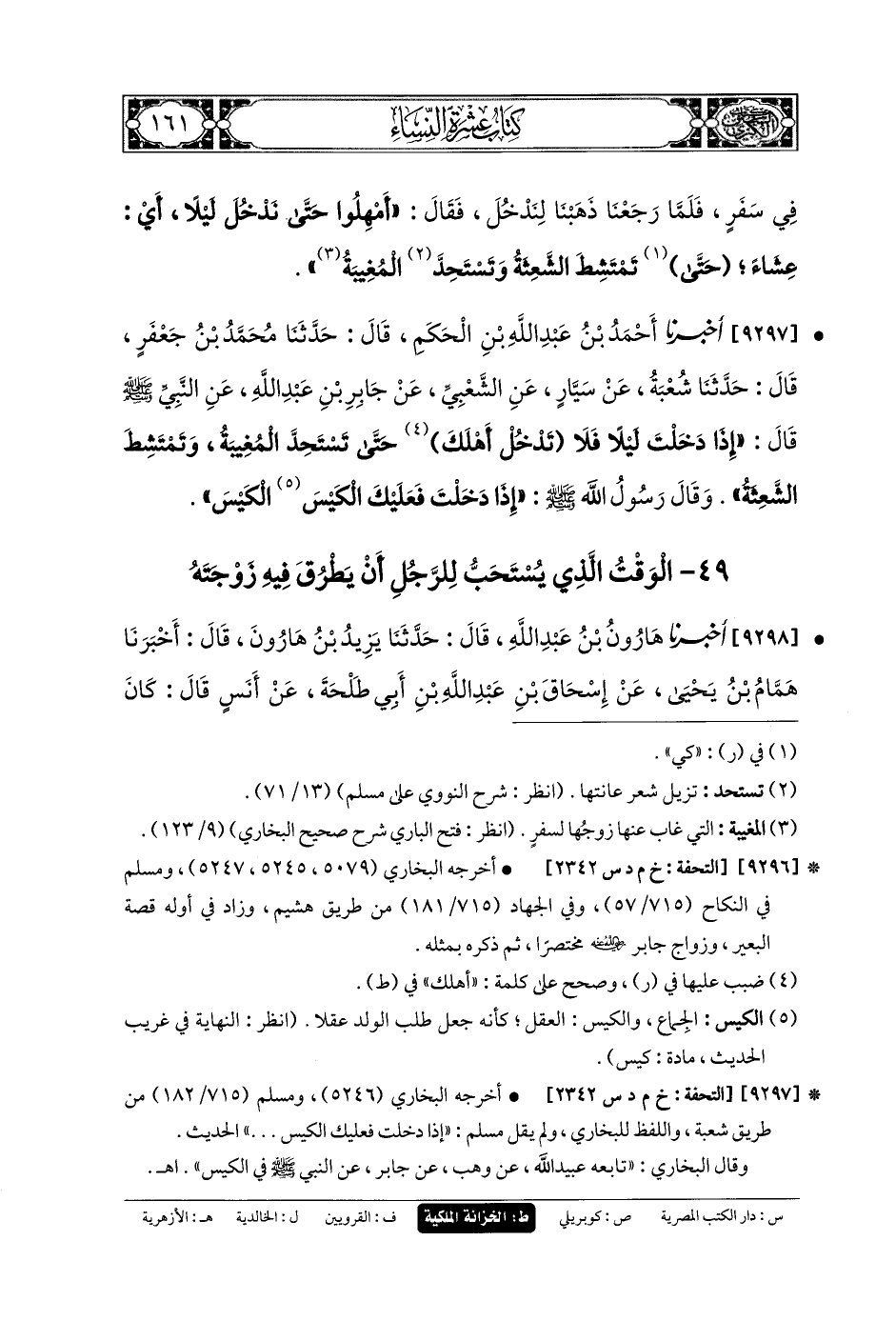 9297- أَخبَرنا أَحْمَدُ بنُ عَبدِ اللهِ بنِ الحَكَمِ، قَالَ: حَدثنا مُحَمدُ بنُ جَعفَرٍ، قَالَ: حَدثنا شُعبَةُ، عَن سَيَّارٍ، عَنِ الشَّعْبِيِّ، عَن جَابِرِ بنِ عَبدِ اللهِ، عَنِ النَّبيِّ صَلى الله عَلَيهِ وسَلم قَالَ: إِذَا دَخَلْتَ لَيْلاً فَلا تَدْخُلْ أَهْلَكَ، حَتَّى تَسْتَحِدَّ المُغِيبَةُ، وَتَمْتَشِطَ الشَّعِثَةُ، وَقَالَ رَسُولُ اللهِ صَلى الله عَلَيهِ وسَلم: إِذَا دَخَلْتَ فَعَلَيْكَ الكَيْسَ الكَيْسَ.