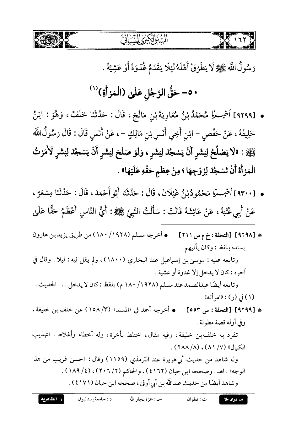 9299- أَخبَرنا مُحَمدُ بنُ مُعاويَةَ بنُ مَالِجٍ، قَالَ: حَدثنا خَلَفٌ، وَهُوَ ابنُ خَلِيفَةَ، عَن حفص ابنِ أَخِي أَنَسِ بنِ مَالِكٍ، عَن أَنَسٍ قَالَ: قَالَ رَسُولُ اللهِ صَلى الله عَلَيهِ وسَلم: لا يَصْلُحُ لِبَشَرٍ أَنْ يَسْجُدَ لِبَشَرٍ، وَلَوْ صَلُحَ لِبَشَرٍ أَنْ يَسْجُدَ لِبَشَرٍ، لأَمَرْتُ المَرْأَةَ أَنْ تَسْجُدَ لِزَوْجِهَا، مِنْ عِظَمِ حَقِّهِ عَلَيْهَا.