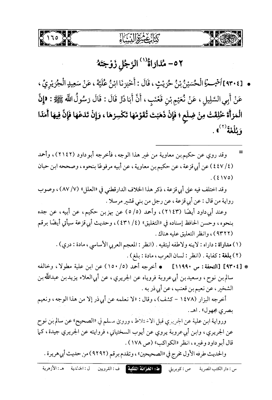 9303- أَخْبَرَنِي حُسَيْنُ بنُ مَنصُورِ بنِ جَعفَرٍ، قَالَ: حَدثنا مُبَشِّرُ بنُ عَبدِ اللهِ، قَالَ: حَدثنا سُفيانُ بنُ حُسَيْنٍ، عَن دَاوُدَ الوَرَّاقِ، قِيلَ: إِنَّهُ دَاوُدُ بنُ أَبي هِنْدٍ، عَن سَعِيدِ بنِ حَكِيمٍ، عَن أَبيهِ، عَن جَدِّهِ مُعاويَةَ قَالَ: أَتَيْتُ النَّبيَّ صَلى الله عَلَيهِ وسَلم، فَلَمَّا دُفِعْتُ إِلَيْهِ، قُلْتُ: بِاللهِ الَّذِي أَرْسَلَكَ، أَهُوَ أَرْسَلَكَ بِمَا تَقُولُ؟ قَالَ: نَعَمْ، قَالَ: وَهُوَ أَمَرَكَ بِمَا تَأْمُرُنَا بِهِ؟ قَالَ: نَعَمْ، قَالَ: فَمَا تَقُولُ فِي نِسَائِنَا؟ قَالَ: هُنَّ حَرْثٌ لَكُمْ، فَأْتُوا حَرْثَكُمْ أَنَّى شِئْتُمْ، وَأَطْعِمُوهُنَّ مِمَّا تَأْكُلُونَ، وَاكْسُوهُنَّ مِمَّا تَلْبَسُونَ، وَلا تَضْرِبُوهُنَّ وَلا تُقَبِّحُوهُنَّ.
