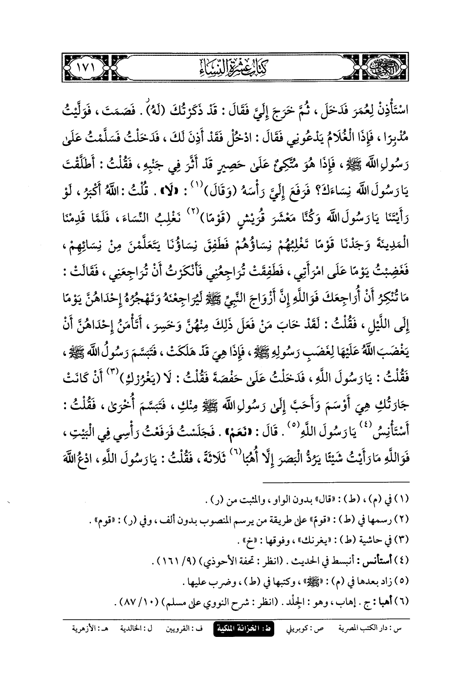 فَكَانَ لِي جَارٌ مِنِ الأَنْصَارِ، وَكُنَّا نَتَنَاوَبُ النُّزُولَ إِلَى رَسُولِ اللهِ صَلى الله عَلَيهِ وسَلم، فَأَنْزِلُ يَوْمًا، وَيَنْزِلُ يَوْمًا، فَيَأْتِينِي بِخَبَرِ الوَحْيِ وَغَيْرِهِ، وَآتِيهِ بِمِثْلِ ذَلِكَ، وَكُنَّا نَتَحَدَّثُ أَنَّ غَسَّانَ تُنْعِلُ الخَيْلَ لِتَغْزُوَنَا، فَنَزَلَ صَاحِبِي يَوْمًا، ثُمَّ أَتَانِي عِشَاءً، فَضَرَبَ بَابِي، ثُمَّ نَادَى، فَخَرَجْتُ إِلَيْهِ فَقَالَ: حَدَثَ أَمْرٌ، قُلْتُ: مَا حَدَثَ؟ جَاءَتْ غَسَّانُ؟ قَالَ: لا، بَلْ هُوَ أَعْظَمُ مِنْ ذَلِكَ، طَلَّقَ النَّبيُّ صَلى الله عَلَيهِ وسَلم نِسَاءَهُ، فَقُلْتُ: لَقَدْ خَابَتْ حَفْصَةُ إِذًا وَخَسِرَتْ، قَدْ كُنْتُ أَظُنُّ هَذَا كَائِنًا، حَتَّى إِذَا صَلَّيْتُ الصُّبْحَ شَدَدْتُ عَلَيَّ ثِيَابِي، ثُمَّ نَزَلْتُ فَدَخَلْتُ عَلَى حَفْصَةَ وَهِيَ تَبْكِي، فَقُلْتُ: ثُمَّ ذَكَرَ كَلِمَةً مَعْنَاهَا، أَطَلَّقَكُنَّ رَسُولُ اللهِ صَلى الله عَلَيهِ وسَلم؟ قَالَتْ: لا أَدْرِي، هَذَا هُوَ مُعْتَزِلٌ فِي هَذِهِ المَشْرُبَةِ، فَلقيتُ غُلامًا لَهُ أَسْوَدَ، فَقُلْتُ: اسْتَأْذِنْ لِعُمَرَ، فَدَخَلَ الغُلامُ، ثُمَّ خَرَجَ إِلَيَّ، فَقَالَ: قَدْ ذَكَرْتُكَ لَهُ، فَصَمَتَ، فَانْطَلَقْتُ حَتَّى أَتَيْتُ المِنْبَرَ، فَإِذَا عِنْدَهُ رَهْطٌ جُلُوسٌ يَبْكِي بَعْضُهُمْ، فَجَلَسْتُ قَلِيلاً فَغَلَبَنِي مَا أَجِدُ، فَأَتَيْتُ الغُلامَ، فَقُلْتُ: اسْتَأْذِنْ لِعُمَرَ، فَدَخَلَ الغُلامُ، ثُمَّ رَجَعَ إِلَيَّ، قَالَ: قَدْ ذَكَرْتُكَ لَهُ، فَصَمَتَ، فَجَلَسْتُ إِلَى المِنْبَرِ، ثُمَّ غَلَبَنِي مَا أَجِدُ، فَرَجَعْتُ إِلَى الغُلامِ، فَقُلْتُ: اسْتَأَذِنْ لِعُمَرَ، فَدَخَلَ، ثُمَّ خَرَجَ إِلَيَّ، فَقَالَ: قَدَ ذَكَرْتُكَ لَهُ، فَصَمَتَ، فَوَلَّيْتُ مُدْبِرًا، فَإِذَا الغُلامُ يَدْعُونِي، فَقَالَ: ادْخُلْ فَقَدْ أَذِنَ لَكَ.