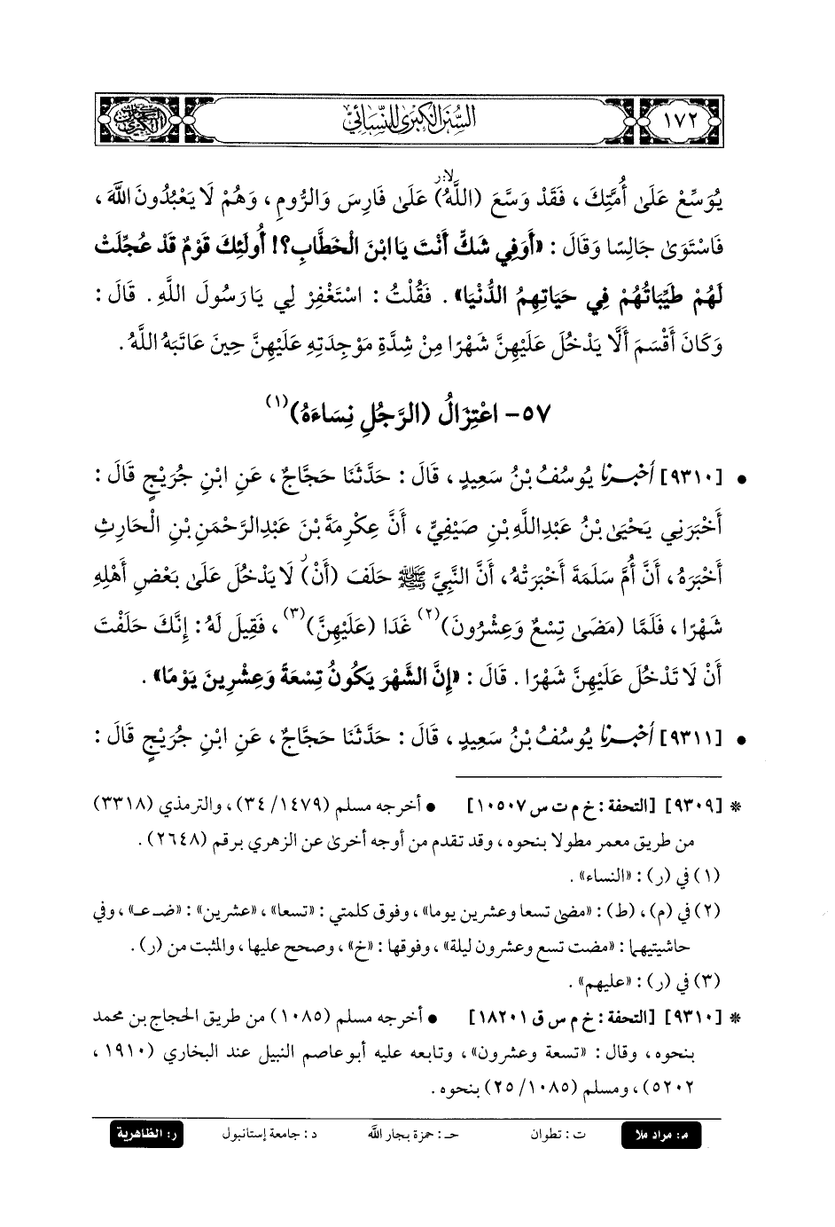 9310- أَخبَرنا يُوسُفُ بنُ سَعِيدٍ، قَالَ: حَدثنا حَجَّاجٌ، عَنِ ابنِ جُرَيْجٍ، قَالَ: أَخْبَرَنِي يَحيَى بنُ عَبدِ اللهِ بنِ صَيْفِيٍّ، أَنَّ عِكْرِمَةَ بْنَ عَبدِ الرَّحمَنِ بنِ الحَارِثِ أَخْبَرَهُ؛ أَنَّ أُمَّ سَلَمَةَ، أَخْبَرَتْهُ، أَنَّ النَّبيَّ صَلى الله عَلَيهِ وسَلم حَلَفَ أَنْ لا يَدْخُلُ عَلَى بَعْضِ أَهْلِهِ شَهْرًا، فَلَمَّا مَضَى تِسْعٌ وَعِشْرُونَ لَيْلَةً، غَدَا عَلَيْهِنَّ، فَقِيلَ لَهُ: إِنَّكَ حَلَفْتَ أَنْ لا تَدْخُلَ عَلَيْهِنَّ شَهْرًا، قَالَ: إِنَّ الشَّهْرَ يَكُونُ تِسْعَةً وَعِشْرِينَ يَوْمًا.