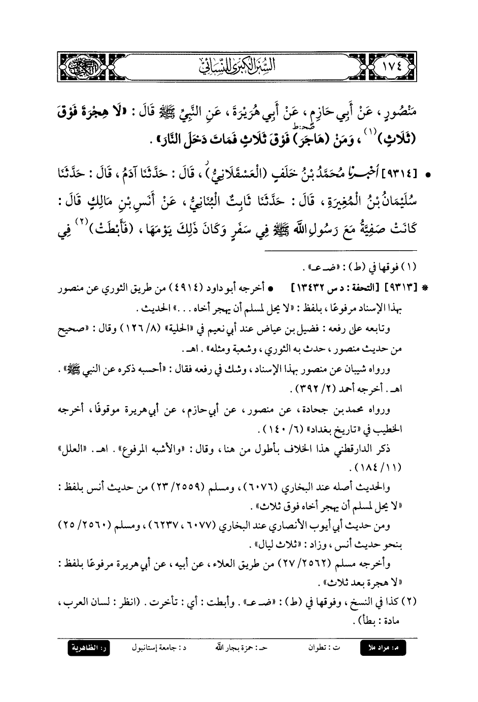 9313- أَخبَرنا مُحَمدُ بنُ رَافِعٍ، قَالَ: حَدثنا شَبَابَةُ، قَالَ: حَدثنا شُعبَةُ، عَن مَنصُورٍ، عَن أَبي حَازِمٍ، عَن أَبي هُرَيْرَةَ، عَنِ النَّبيِّ صَلى الله عَلَيهِ وسَلم قَالَ: لا هِجْرَةَ فَوْقَ ثَلاثٍ، وَمَنْ هَاجَرَ فَوْقَ ثَلاثٍ فَمَاتَ دَخَلَ النَّارَ.