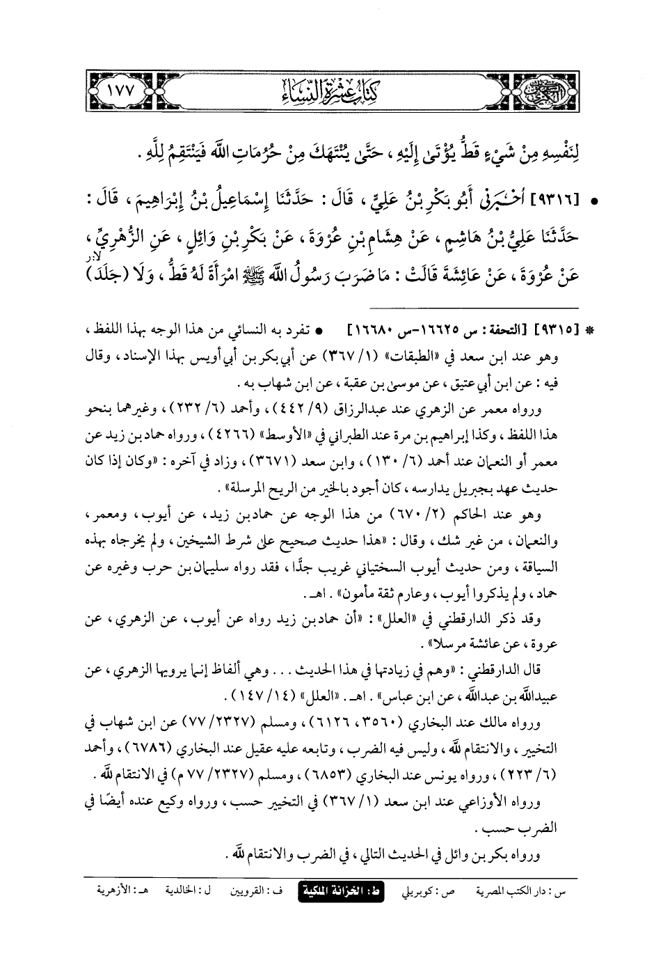 9315- أَخبَرنا مُحَمدُ بنُ نَصْرٍ، قَالَ: حَدثنا أَيوبُ بنُ سُلَيمَانَ هو ابن بلال، قَالَ: حَدَّثني أَبو بَكْرٍ وهو ابن أبي أويس، عَن سُلَيمَانَ هو ابن بلال، عَن مُحَمدٍ هو ابن أبي عتيق، وَمُوسَى يعني ابن عقبة، عَنِ ابنِ شِهَابٍ، عَن عُرْوَةَ بنِ الزُّبَيْرِ، أَنَّ عَائِشَةَ قَالَتْ: وَاللهِ مَا ضَرَبَ رَسُولُ اللهِ صَلى الله عَلَيهِ وسَلم بِيَدِهِ امْرَأَةً لَهُ قَطُّ، وَلا خَادِمًا لَهُ قَطُّ، وَلا ضَرَبَ بِيَدِهِ شَيْئًا قَطُّ، إِلاَّ أَنْ يُجَاهِدَ فِي سَبِيلِ اللهِ، وَلا خُيِّرَ بَيْنَ أَمْرَيْنِ قَطُّ إِلاَّ اخْتَارَ أَيْسَرَهُمَا، مَا لَمْ يَكُنْ مَأْثَمًا، فَإِنْ كَانَ إِثْمًا كَانَ أَبَعْدَ النَّاسِ، وَوَاللَّهِ مَا انْتَقَمَ لِنَفْسِهِ مِنْ شَيْءٍ قَطُّ يُؤْتَى إِلَيْهِ، حَتَّى يُنْتَهَكَ مِنْ حُرُمَاتِ اللهِ، فَيَنْتَقِمُ لِلَّهِ.