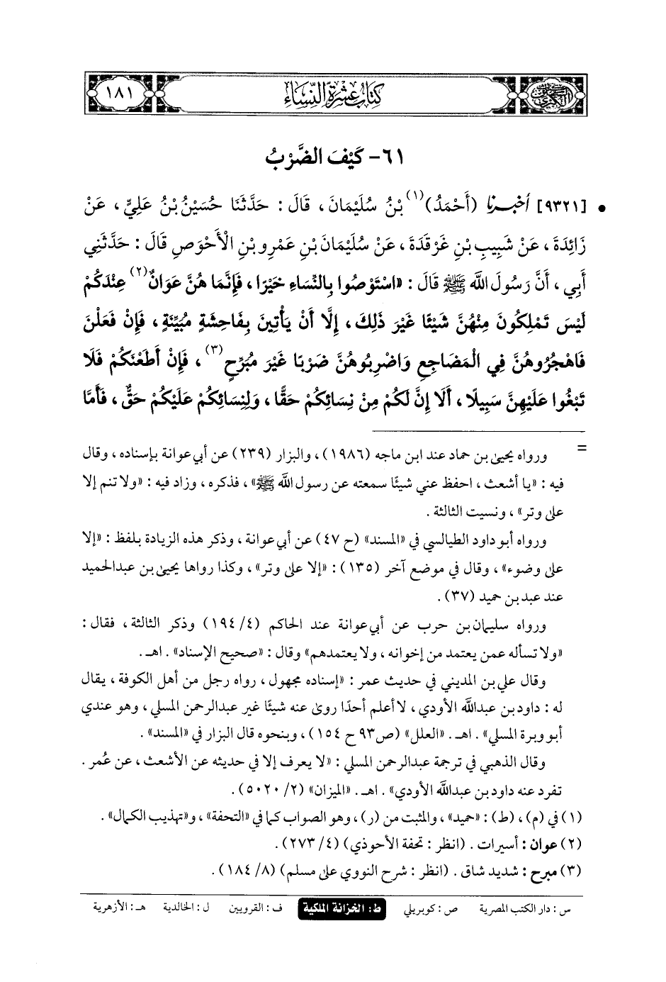 9320- أَخبَرنا إِسحَاقُ بنُ مَنصُورٍ، وَعَمْرُو بنُ عَليٍّ، عَن عَبدِ الرَّحمَنِ، قَالَ: حَدثنا أَبو عَوَانَةَ، عَن دَاوُدَ بنِ عَبدِ اللهِ، عَن عَبدِ الرَّحمَنِ المُسْلِيِّ، عَنِ الأَشْعَثِ بنِ قَيْسٍ، عَن عُمَرَ بنِ الخَطَّابِ قَالَ: قَالَ رَسُولُ اللهِ صَلى الله عَلَيهِ وسَلم: لا يُسْأَلُ الرَّجُلُ فِيمَ ضَرَبَ امْرَأَتَهُ.