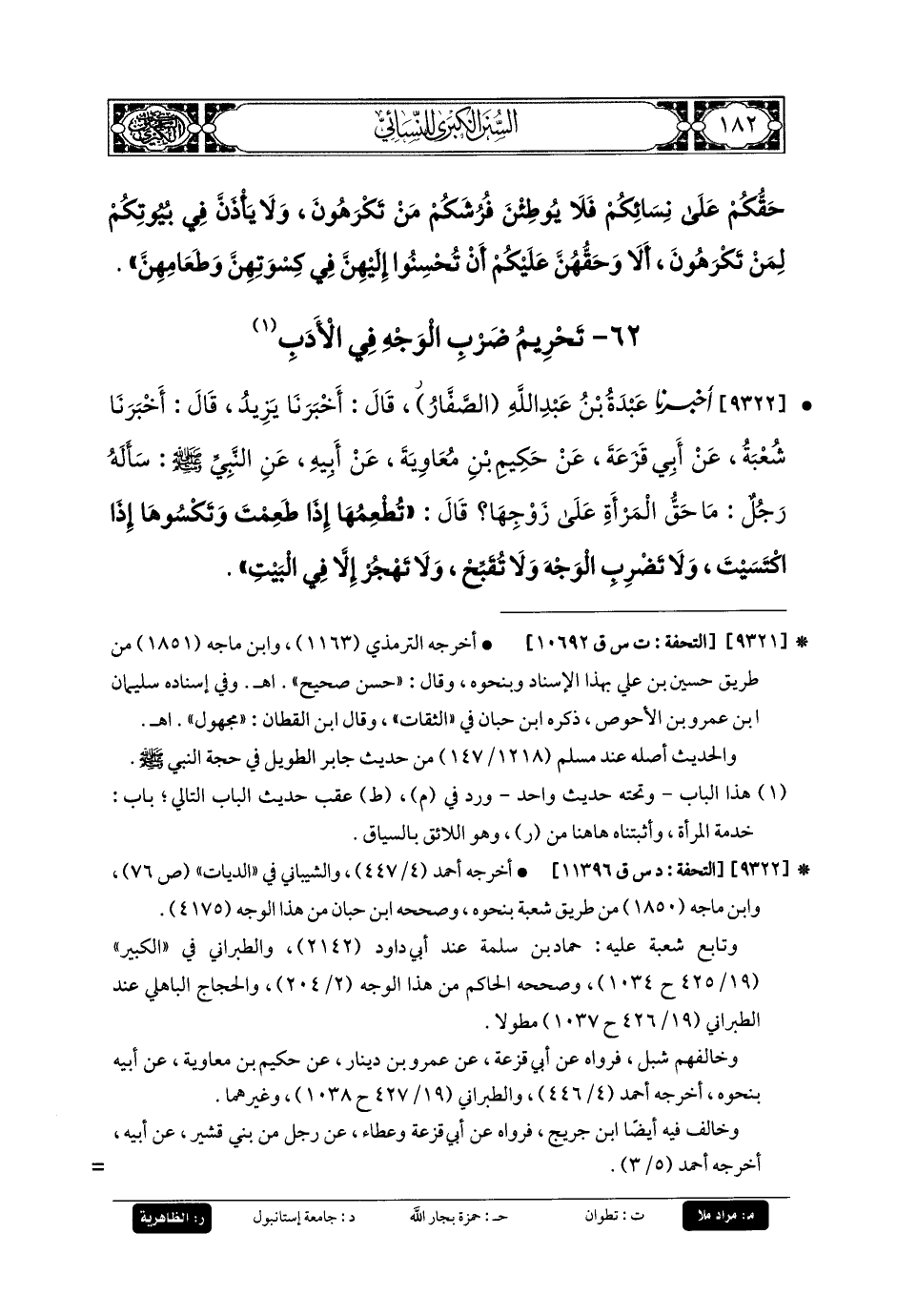 9321- أَخبَرنا أَحْمَدُ بنُ سُلَيمَانَ، قَالَ: حَدثنا حُسَيْنُ بنُ عَليٍّ، عَن زَائِدَةَ، عَن شَبِيبِ بنِ غَرْقَدَةَ، عَن سُلَيمَانَ بنِ عَمْرِو بنِ الأَحْوَصِ، قَالَ: حَدَّثني أَبي، أَنَّ رَسُولَ اللهِ صَلى الله عَلَيهِ وسَلم قَالَ: اسْتَوْصُوا بِالنِّسَاءِ خَيْرًا، فَإِنَّمَا هُنَّ عَوَانٌ عِنْدَكُمْ، لَيْسَ تَمْلِكُونَ مِنْهُنَّ شَيْئًا غَيْرَ ذَلِكَ {إِلاَّ أَنْ يَأْتِينَ بِفَاحِشَةٍ مُبَيِّنَةٍ} فَإِنْ فَعَلْنَ، فَاهْجُرُوهُنَّ فِي المَضَاجِعِ، وَاضْرِبُوهُنَّ ضَرْبًا غَيْرَ مُبَرِّحٍ، فَإِنْ أَطَعْنَكُمْ فَلا تَبْغُوا عَلَيْهِنَّ سَبِيلاً، ألاَّ إِنَّ لَكُمْ مِنْ نِسَائِكُمْ حَقًّا، وَلِنِسَائِكُمْ عَلَيْكُمْ حَقٌّ، فَأَمَّا حَقُّكُمْ عَلَى نِسَائِكُمْ، فَلا يُوطِئْنَ فُرُشَكُمْ مَنْ تَكْرَهُونَ، وَلا يَأْذَنَّ فِي بُيُوتِكُمْ لِمَنْ تَكْرَهُونَ، أَلا وَحَقُّهُنَّ عَلَيْكُمْ أَنْ تُحْسِنُوا إِلَيْهِنَّ فِي كِسْوَتِهِنَّ، وَطَعَامِهِنَّ.