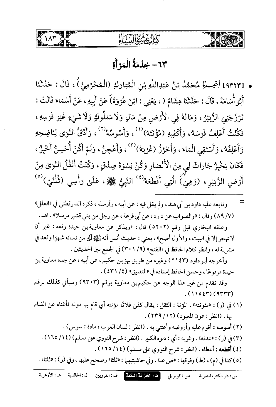 9322- أَخبَرنا عَبدَةُ بنُ عَبدِ اللهِ الصفار، قَالَ: أَخبَرنا يَزِيدُ، قَالَ: أَخبَرنا شُعبَةُ، عَن أَبي قَزَعَةَ، عَن حَكِيمِ بنِ مُعاويَةَ، عَن أَبيهِ، عَنِ النَّبيِّ صَلى الله عَلَيهِ وسَلم سَأَلَهُ رَجُلٌ: مَا حَقُّ المَرْأَةِ عَلَى زَوْجِهَا؟ قَالَ: تُطْعِمُهَا إِذَا طَعِمْتَ، وَتَكْسُوَهَا إِذَا اكْتَسَيْتَ، وَلا تَضْرِبِ الوَجْهَ، وَلا تُقَبِّحْ، وَلا تَهْجُرْ إِلاَّ فِي البَيْتِ.