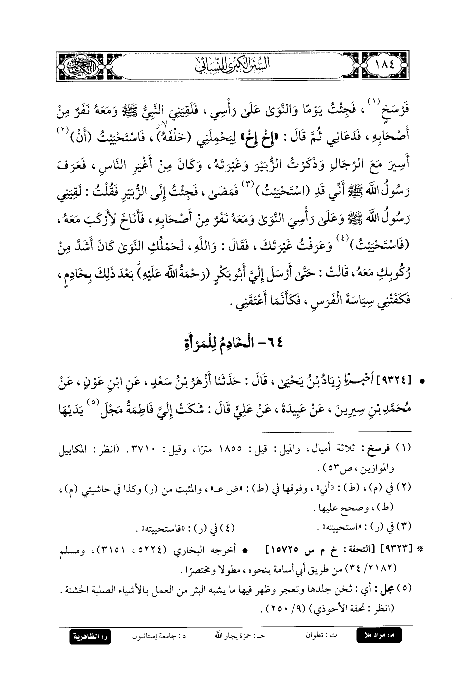 9323- أَخبَرنا مُحَمدُ بنُ عَبدِ اللهِ بنِ المُبَارَكِ المخرمي، قَالَ: حَدثنا أَبو أُسَامَةَ، قَالَ: حَدثنا هِشَامٌ يعني ابن عروة، عَن أَبيهِ، عَن أَسْمَاءَ قَالَتْ: تَزَوَّجَنِي الزُّبَيْرُ وَمَا لَهُ فِي الأَرْضِ مِنْ مَالٍ، وَلا مَمْلُوكٍ، وَلا شَيْءٍ غَيْرَ فَرَسِهِ، فَكُنْتُ أَعْلِفُ فَرَسَهُ، وَأَكْفِيهِ مُؤْنَتَهُ وَأَسُوسُهُ، وَأَدُقُّ النَّوَى لِنَاضِحِهِ، وَأَعْلِفُهُ، وَأَسْتَقِي المَاءَ، وَأَخْرُزُ غَرْبَهُ، وَأَعْجِنُ، وَلَمْ أَكُنْ أُحْسِنُ أَخْبِزُ، فَكَانَ يَخْبِزُ جَارَاتٌ لِي مِنَ الأَنْصَارِ، وَكُنَّ نِسْوَةَ صِدْقٍ، وَكُنْتُ أَنْقُلُ النَّوَى مِنْ أَرْضِ الزُّبَيْرِ، وَهِيَ الَّتِي أَقْطَعَهُ النَّبيُّ صَلى الله عَلَيهِ وسَلم عَلَى رَأْسِي ثُلُثَيْ فَرْسَخٍ، فَجِئْتُ يَوْمًا وَالنَّوَى عَلَى رَأْسِي، فَلَقِيَنِي النَّبيُّ صَلى الله عَلَيهِ وسَلم وَمَعَهُ نَفَرٌ مِنْ أَصْحَابٍهٍ، فَدَعَانِي، ثُمَّ قَالَ: إِخْ، إِخْ، لِيَحْمِلَنِي خَلْفَهُ، فَاسْتَحْيَيْتُ أَنْ أَسِيرَ مَعَ الرِّجَالِ، وَذَكَرْتُ الزُّبَيْرَ وَغَيْرَتَهُ، وَكَانَ مِنْ أَغْيَرِ النَّاسِ، فَعَرَفَ رَسُولُ اللهِ صَلى الله عَلَيهِ وسَلم أَنْ قَدِ اسْتَحْيَيْتُ، فَمَضَى، فَجِئْتُ إِلَى الزُّبَيْرِ، فَقُلْتُ: لَقِيَنِي رَسُولُ اللهِ صَلى الله عَلَيهِ وسَلم وَعَلَى رَأْسِي النَّوَى وَمَعَهُ نَفَرٌ مِنْ أَصْحَابِهِ، فَأَنَاخَ لأَرْكَبَ مَعَهُ، فَاسْتَحْيَيْتُ، وَعَرَفْتُ غَيْرَتَكَ، فَقَالَ: وَاللهِ لَحَمْلُكِ النَّوَى كَانَ أَشَدَّ مِنْ رُكُوبِكِ مَعَهُ، قَالَتْ: حَتَّى أَرْسَلَ إِلَيَّ أَبو بَكْرٍ رحمه الله عليه بَعْدَ ذَلِكَ بِخَادِمٍ، فَكَفَتْنِي سِيَاسَةَ الفَرَسِ، فَكَأَنَّمَا أَعْتَقَنِي.