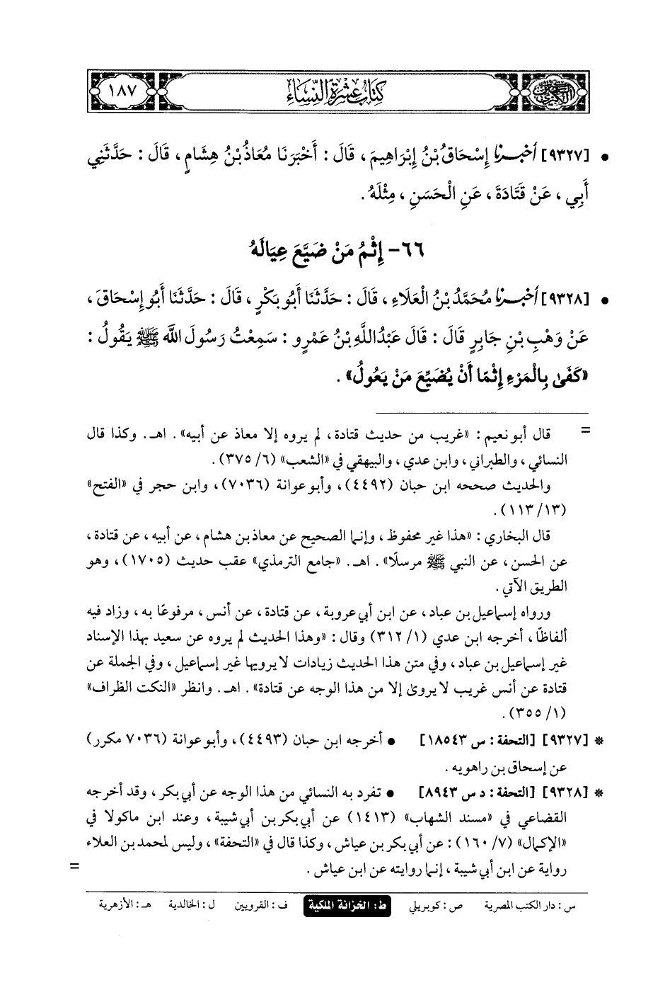 9327- أَخبَرنا إِسحَاقُ بنُ إِبْرَاهِيمَ، قَالَ: أَخبَرنا مُعَاذُ بنُ هِشَامٍ، قَالَ: حَدَّثني أَبي، عَن قَتَادَةَ، عَنِ الحَسَنِ، مِثْلَهُ.