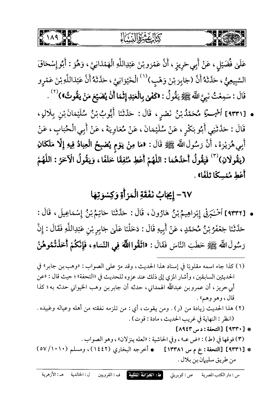 9330- أَخبَرنا مُحَمدُ بنُ عَبدِ الأَعْلَى، قَالَ: حَدثنا المُعْتَمِرُ، قَالَ: قَرَأْتُ عَلَى فُضَيْلٍ، عَن أَبي حَرِيزٍ، أَنَّ عَمْرَو بْنَ عَبدِ اللهِ الهَمَدَانِيَّ، وَهُوَ أَبو إِسحَاقَ السَّبِيعِيُّ حَدَّثَهُ، أَنَّ وَهْبَ بْنَ جَابِرٍ (1) الخَيْوَانِيَّ حَدَّثَهُ، أَنَّ عَبدَ اللهِ بْنَ عَمْرٍو قَالَ: سَمِعْتُ نَبِيَّ اللهِ صَلى الله عَلَيهِ وسَلم يَقُولُ: كَفَى بِالعَبدِ إِثْمًا أَنْ يُضَيِّعَ مَنْ يَقُوتُ.