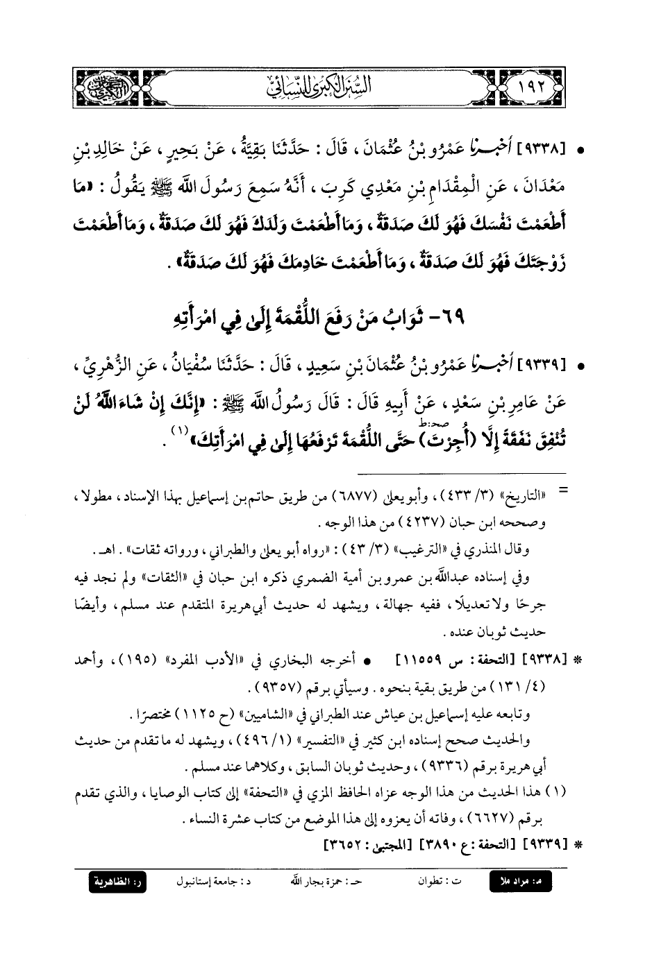 9338- أَخبَرنا عَمْرُو بنُ عُثْمَانَ، قَالَ: حَدثنا بَقِيَّةُ، عَن بَحِيرٍ، عَن خَالِدِ بنِ مَعْدَانَ، عَنِ المِقْدَامِ بنِ مَعْدِي كَرِبَ، أَنَّهُ سَمِعَ رَسُولَ اللهِ صَلى الله عَلَيهِ وسَلم يَقُولُ: مَا أَطْعَمْتَ نَفْسَكَ فَهُوَ لَكَ صَدَقَةٌ، وَمَا أَطْعَمْتَ وَلَدَكَ فَهُوَ لَكَ صَدَقَةٌ، وَمَا أَطْعَمْتَ زَوْجَتَكَ فَهُوَ لَكَ صَدَقَةٌ، وَمَا أَطْعَمْتَ خَادِمَكَ فَهُوَ لَكَ صَدَقَةٌ.