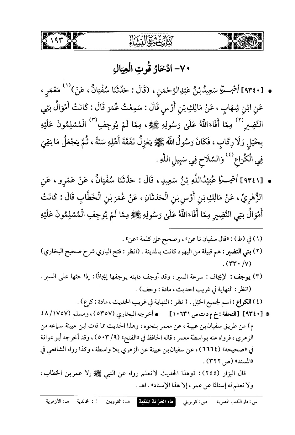 9340- أَخبَرنا سَعِيدُ بنُ عَبدِ الرَّحمَنِ، قَالَ: حَدثنا سُفيانُ، عَن مَعْمَرٍ، عَنِ ابنِ شِهَابٍ، عَن مَالِكِ بنِ أَوْسٍ، قَالَ: سَمِعْتُ عُمَرَ قَالَ: كَانَتْ أَمْوَالُ بَنِي النَّضِيرِ مِمَّا أَفَاءَ اللهُ عَلَى رَسُولِهِ صَلى الله عَلَيهِ وسَلم، مِمَّا لَمْ يُوجِفِ المُسْلِمُونَ عَلَيْهِ بِخَيْلٍ وَلا رِكَابٍ، فَكَانَ رَسُولُ اللهِ صَلى الله عَلَيهِ وسَلم يَعْزِلُ نَفَقَةَ أَهْلِهِ سَنَةً، ثُمَّ يَجْعَلُ مَا بَقِيَ فِي الكُرَاعِ وَالسِّلاحِ فِي سَبِيلِ اللهِ.
