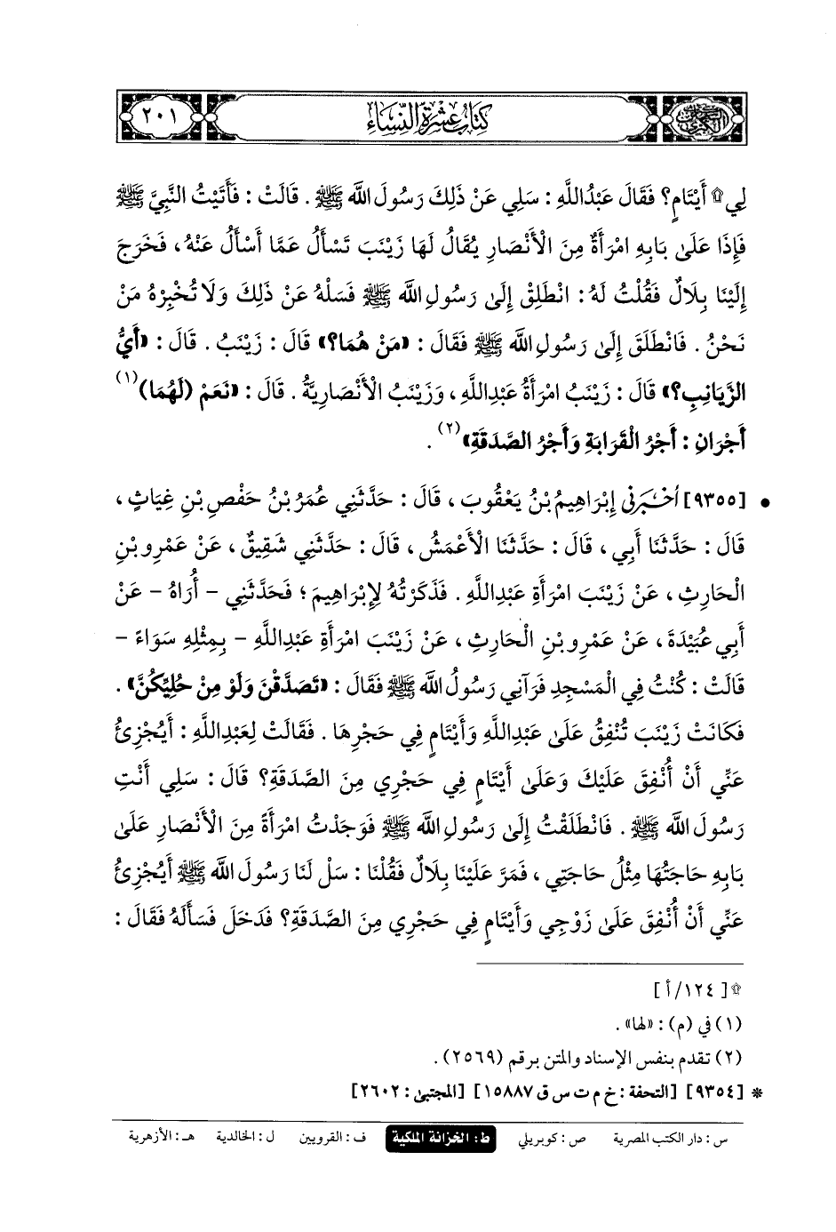 9354- أَخبَرنا بِشْرُ بنُ خَالِدٍ العَسْكَرِيُّ، قَالَ: حَدثنا غُنْدَرٌ، عَن شُعبَةَ، عَن سُلَيمَانَ، عَن أَبي وَائِلٍ، عَن عَمْرِو بنِ الحَارِثِ، عَن زَيْنَبَ امْرَأَةِ عَبدِ اللهِ قَالَتْ: قَالَ رَسُولُ اللهِ صَلى الله عَلَيهِ وسَلم لِلنِّسَاءِ: تَصَدَّقْنَ وَلَوْ مِنْ حُلِيِّكُنَّ، قَالَتْ: وَكَانَ عَبدُ اللهِ خَفِيفَ ذَاتِ اليَدِ، فَقَالَتْ لَهُ: أَيَسَعُنِي أَنْ أَضَعَ صَدَقَتِي فِيكَ وَفِي بَنِي أَخٍ لِي أَيْتَامٍ؟ فَقَالَ عَبدُ اللهِ: سَلِي عَن ذَلِكَ رَسُولَ اللهِ صَلى الله عَلَيهِ وسَلم، قَالَتْ: فَأَتَيْتُ النَّبيَّ صَلى الله عَلَيهِ وسَلم، فَإِذَا عَلَى بَابِهِ امْرَأَةٌ مِنَ الأَنْصَارِ، يُقَالُ لَهَا: زَيْنَبُ تَسْأَلُ عَمَّا أَسْأَلُ عَنهُ، فَخَرَجَ إِلَيْنَا بِلالٌ، فَقُلْتُ لَهُ: انْطَلِقْ إِلَى رَسُولِ اللهِ صَلى الله عَلَيهِ وسَلم فَسَلْهُ عَن ذَلِكَ، وَلا تُخْبِرْهُ مَنْ نَحْنُ، فَانْطَلَقْ إِلَى رَسُولِ اللهِ صَلى الله عَلَيهِ وسَلم فَقَالَ: مَنْ هُمَا؟ قَالَ: زَيْنَبُ، قَالَ: أَيُّ الزَّيَانِبِ؟ قَالَ: زَيْنَبُ امْرَأَةُ عَبدِ اللهِ، وَزَيْنَبُ الأَنْصَارِيَّةُ، قَالَ: نَعَمْ، لَهَا أَجْرَانِ: أَجْرُ القَرَابَةِ، وَأَجْرُ الصَّدَقَةِ.