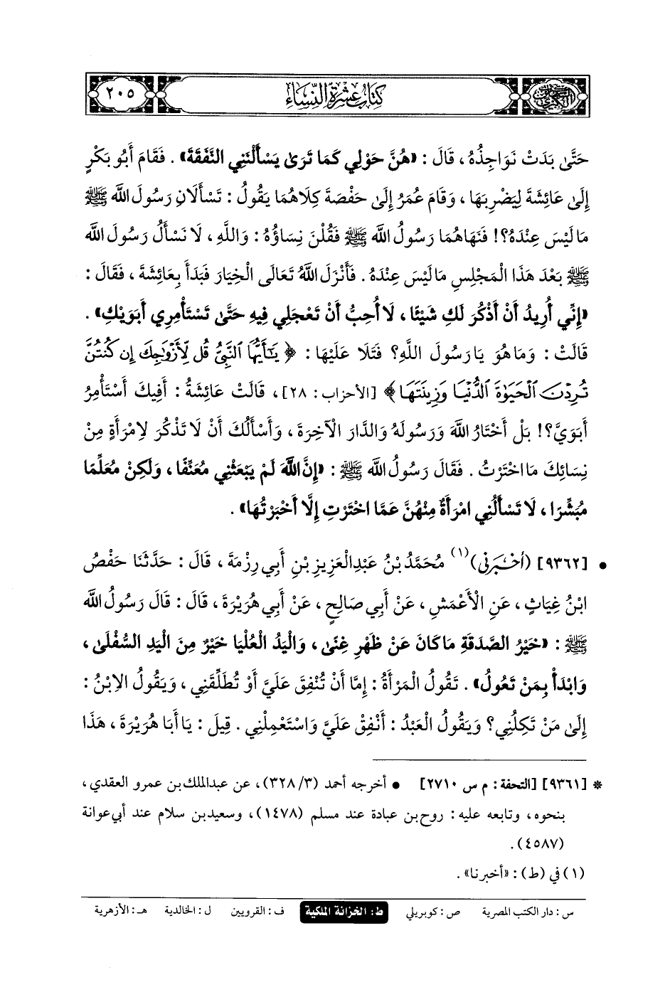 9361- أَخبَرنا سُلَيمَانُ بنُ عُبَيدِ اللهِ بنِ عَمْرٍو، كَتَبْنَا عَنهُ بِالبَصْرَةِ، قَالَ: حَدثنا أَبو عَامِرٍ عَبدُ المَلِكِ بنُ عَمْرٍو، قَالَ: حَدثنا زَكَرِيَّا بنُ إِسحَاقَ، عَن أَبي الزُّبَيْرِ، عَن جَابِرِ بنِ عَبدِ اللهِ قَالَ: أَقْبَلَ أَبو بَكْرٍ يَسْتَأْذِنُ عَلَى النَّبيِّ صَلى الله عَلَيهِ وسَلم، وَالنَّاسُ بِبَابِهِ جُلُوسٌ، فَلَمْ يُؤْذَنْ لَهُ، ثُمَّ أَقْبَلَ عُمَرُ، فَاسْتَأْذَنَ، فَلَمْ يُؤْذَنْ لَهُ، فَجَلَسَ، ثُمَّ أَذِنَ لأَبي بَكْرٍ وَعُمَرَ فَدَخَلا، وَالنَّبيُّ صَلى الله عَلَيهِ وسَلم جَالِسٌ وَحَوْلَهُ نِسَاؤُهُ، وَهُوَ سَاكِتٌ فاحمٌ، قَالَ عُمَرُ: لأُكَلِّمَنَّ النَّبيَّ صَلى الله عَلَيهِ وسَلم لَعَلَّهُ أَنْ يَضْحَكَ، قَالَ عُمَرُ: يَا رَسُولَ اللهِ، لَوْ رَأَيْتَ ابنَةَ زَيْدٍ امْرَأَةَ عُمَرَ سَأَلَتْنِي النَّفَقَةَ آنِفًا، فَوَجَأْتُ عُنُقَهَا، فَضَحِكَ النَّبيُّ صَلى الله عَلَيهِ وسَلم حَتَّى بَدَتْ نَوَاجِذُهُ، قَالَ: هُنَّ حَوْلِي كَمَا تَرَى يَسْأَلْنَنِي النَّفَقَةَ، فَقَامَ أَبو بَكْرٍ إِلَى عَائِشَةَ لِيَضْرِبَهَا، وَقَامَ عُمَرُ إِلَى حَفْصَةَ، كِلاهُمَا يَقُولُ: تَسْأَلانِ رَسُولَ اللهِ صَلى الله عَلَيهِ وسَلم مَا لَيْسَ عِنْدَهُ، فَنَهَاهُمَا رَسُولُ اللهِ صَلى الله عَلَيهِ وسَلم، فَقُلْنَ نِسَاؤُهُ: وَاللهِ لا نَسْأَلُ رَسُولَ اللهِ صَلى الله عَلَيهِ وسَلم بَعْدَ هَذَا المَجْلِسِ مَا لَيْسَ عِنْدَهُ، فَأَنْزَلَ اللهُ تَعَالَى الخِيَارَ، فَبَدَأَ بِعَائِشَةَ فَقَالَ: إِنِّي أُرِيدُ أَنْ أَذْكُرَ لَكِ شَيْئًا، لا أُحِبُّ أَنْ تَعْجَلِي فِيهِ حَتَّى تَسْتَأْمِرِي أَبَوَيْكِ، قَالَتْ: وَمَا هُوَ يَا رَسُولَ اللهِ، فَتَلا عَلَيْهَا: {يَا أَيُّهَا النَّبيُّ قُلْ لأَزْوَاجِكَ إِنْ كُنْتُنَّ تُرِدْنَ الحَيَاةَ الدُّنْيَا وَزِينَتِهَا} قَالَتْ عَائِشَةُ: أَفِيكَ أَسْتَأْمِرُ أَبَوَيَّ؟ بَلْ أَخْتَارُ اللهَ وَرَسُولَهُ وَالدَّارَ الآخِرَةَ، وَأَسْأَلُكَ أَنْ لا تَذْكُرَ لاِمْرَأَةٍ مِنْ نِسَائِكَ مَا اخْتَرْتُ، فَقَالَ رَسُولُ اللهِ صَلى الله عَلَيهِ وسَلم: إِنَّ اللهَ لَمْ يَبْعَثْنِي مُعَنِّفًا، وَلَكِنْ مُعَلِّمًا مُبَشِّرًا، لا تَسْأَلَنِي امْرَأَةٌ مِنْهُنَّ عَمَّا اخْتَرْتِ إِلاَّ أَخْبَرْتُهَا.