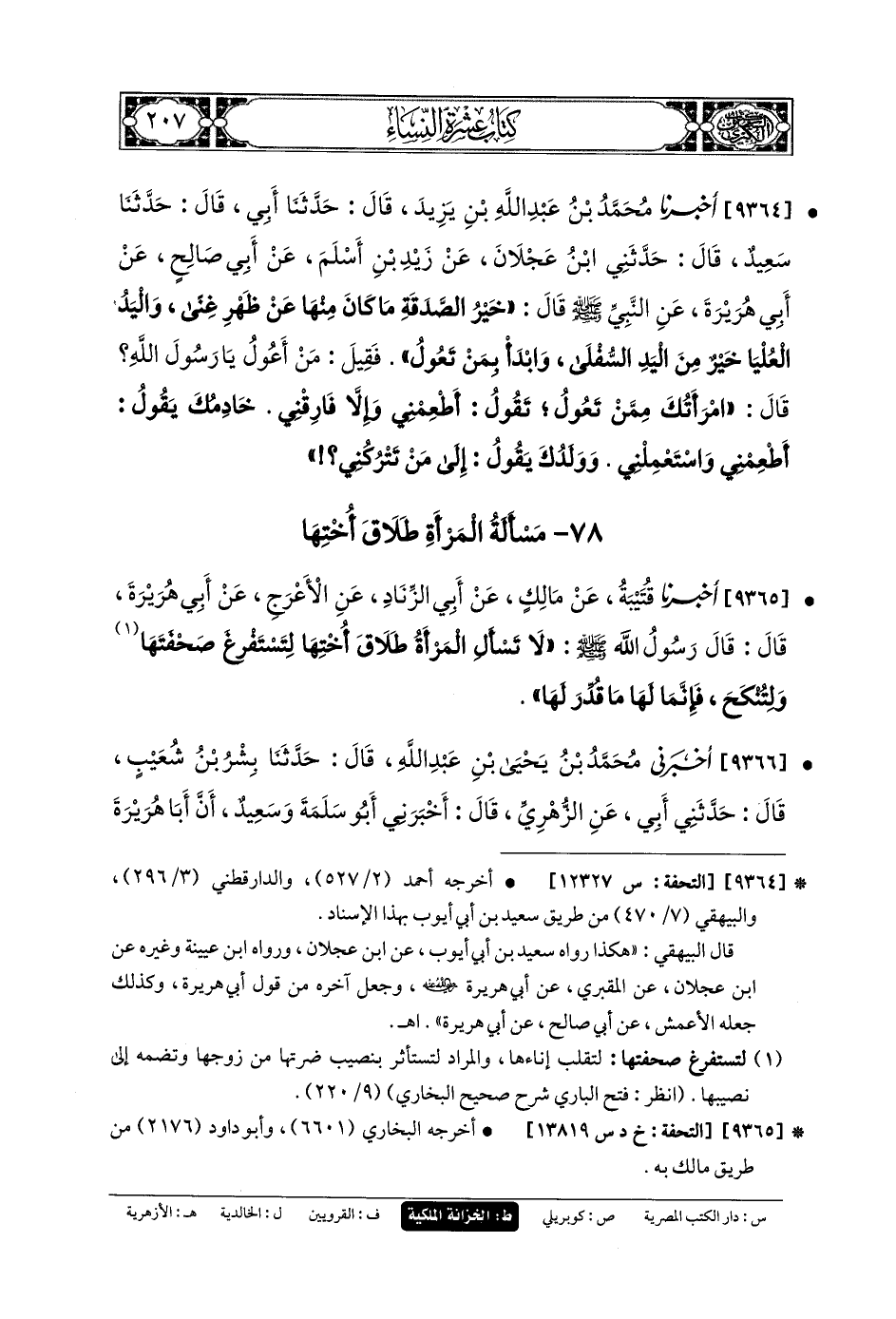 9363- أَخْبَرَنِي عِمْرَانُ بنُ بَكَّارٍ، قَالَ: أَخبَرنا الرَّبِيعُ بنُ رَوْحٍ، قَالَ: حَدثنا مُغِيرَةُ بنُ عَبدِ الرَّحمَنِ، قَالَ: حَدثنا مُحَمدُ بنُ عَجْلانَ، عَن زَيْدِ بنِ أَسْلَمَ، عَن أَبي صَالِحٍ، عَن أَبي هُرَيْرَةَ، عَنِ النَّبيِّ صَلى الله عَلَيهِ وسَلم قَالَ: اليَدُ العُلْيَا خَيْرٌ مِنَ اليَدِ السُّفْلَى، وَابْدَأْ بِمَنْ تَعُولُ، قَالَ زَيْدٌ: فَسُئِلَ أَبو هُرَيْرَةَ: مَنْ تَعُولُ يَا أَبَا هُرَيْرَةَ؟ قَالَ: امْرَأَتُكَ، تَقُولُ: أَنْفِقْ عَلَيَّ أَوْ طَلِّقْنِي، وَعَبدُكَ يَقُولُ: أَطْعِمْنِي وَاسْتَعْمِلْنِي، وَابْنُكَ يَقُولُ: إِلَى مَنْ تَذَرُنِي.