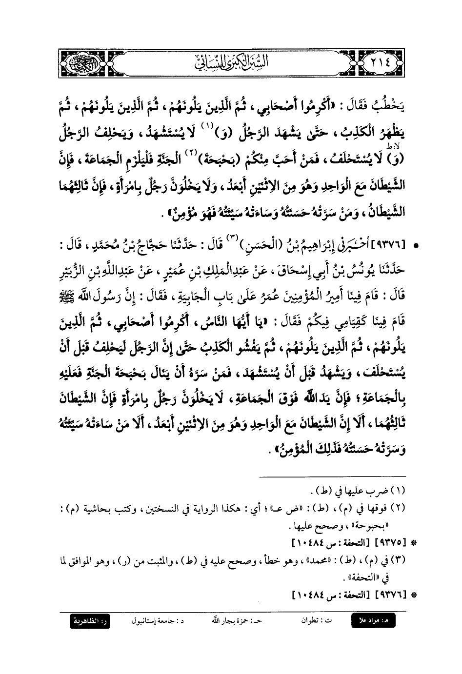 9375- أَخبَرنا قُرَيْشُ بنُ عَبدِ الرَّحمَنِ، قَالَ: حَدثنا عَليُّ بنُ الحَسَنِ، قَالَ: أَخبَرنا الحُسَيْنُ بنُ وَاقِدٍ، قَالَ: حَدثنا عَبدُ المَلِكِ بنُ عُمَيْرٍ، قَالَ: سَمِعْتُ ابنَ الزُّبَيْرِ يَقُولُ: سَمِعْتُ عُمَرَ بْنَ الخَطَّابِ يَخْطُبُ يَقُولُ: سَمِعْتُ رَسُولَ اللهِ صَلى الله عَلَيهِ وسَلم يَخْطُبُ فَقَالَ: أَكْرِمُوا أَصْحَابِي، ثُمَّ الَّذِينَ يَلُونَهُمْ، ثُمَّ الَّذِينَ يَلُونَهُمْ، ثُمَّ يَظْهَرُ الكَذِبُ، حَتَّى يَشْهَدَ الرَّجُلُ وَلا يُسْتَشْهَدُ، وَيَحْلِفَ الرَّجُلُ، وَلا يُسْتَحْلَفُ، فَمَنْ أَحَبَّ مِنْكُمْ بَحْبَحَةَ الجَنَّةِ، فَلْيَلْزَمِ الجَمَاعَةَ، فَإِنَّ الشَّيْطَانَ مَعَ الوَاحِدِ، وَهُوَ مِنَ الاِثْنَيْنِ أَبَعْدُ، وَلا يَخْلُوَنَّ رَجُلٌ بِامْرَأَةٍ، فَإِنَّ ثَالِثَهُمَا الشَّيْطَانُ، وَمَنْ سَرَّتْهُ حَسَنَتُهُ وَسَاءَتْهُ سَيِّئَتُهُ، فَهُوَ مُؤْمِنٌ.