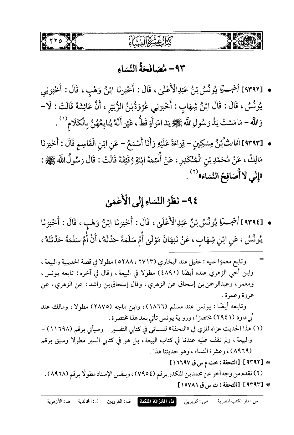 9393- الحَارِثُ بنُ مِسْكِينٍ، قِرَاءَةً عَلَيْهِ، وَأنا أَسْمَعُ، عَنِ ابنِ القَاسِمِ، قَالَ: أَخبَرنا مَالِكٌ، عَن مُحَمدِ بنِ المُنْكَدِرِ، عَن أُمَيْمَةَ ابنَةِ رُقَيْقَةَ قَالَتْ: قَالَ رَسُولُ اللهِ صَلى الله عَلَيهِ وسَلم: إِنِّي لا أُصَافِحُ النِّسَاءَ.