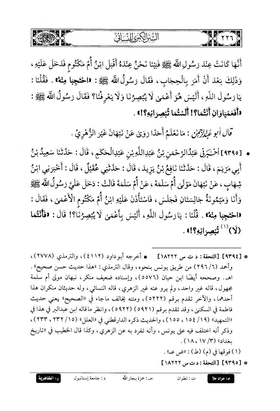 9394- أَخبَرنا يُونُسُ بنُ عَبدِ الأَعْلَى، قَالَ: أَخبَرنا ابنُ وَهْبٍ، قَالَ: أَخبَرنا يُونُسُ، عَنِ ابنِ شِهَابٍ، عَن نَبْهَانَ، مَوْلَى أُمِّ سَلَمَةَ حَدَّثَهُ، أَنَّ أُمَّ سَلَمَةَ حَدَّثَتْهُ، أَنَّهَا كَانَتْ عِنْدَ رَسُولِ اللهِ صَلى الله عَلَيهِ وسَلم، فَبَيْنَا نَحْنُ عِنْدَهُ، أَقْبَلَ ابنُ أُمِّ مَكْتُومٍ، فَدَخَلَ عَلَيْهِ، وَذَلِكَ بَعْدَ أَنْ أُمِرَ بِالحِجَابِ، فَقَالَ رَسُولُ اللهِ صَلى الله عَلَيهِ وسَلم: احْتَجِبَا مِنْهُ، فَقُلْنَا: يَا رَسُولَ اللهِ، أَلَيْسَ هُوَ أَعْمَى لا يُبْصِرُنَا، وَلا يَعْرِفُنَا؟ فَقَالَ رَسُولُ اللهِ صَلى الله عَلَيهِ وسَلم: أَفَعَمْيَاوَانِ أَنْتُمَا؟ أَلَسْتُمَا تُبْصِرَانِهِ؟.