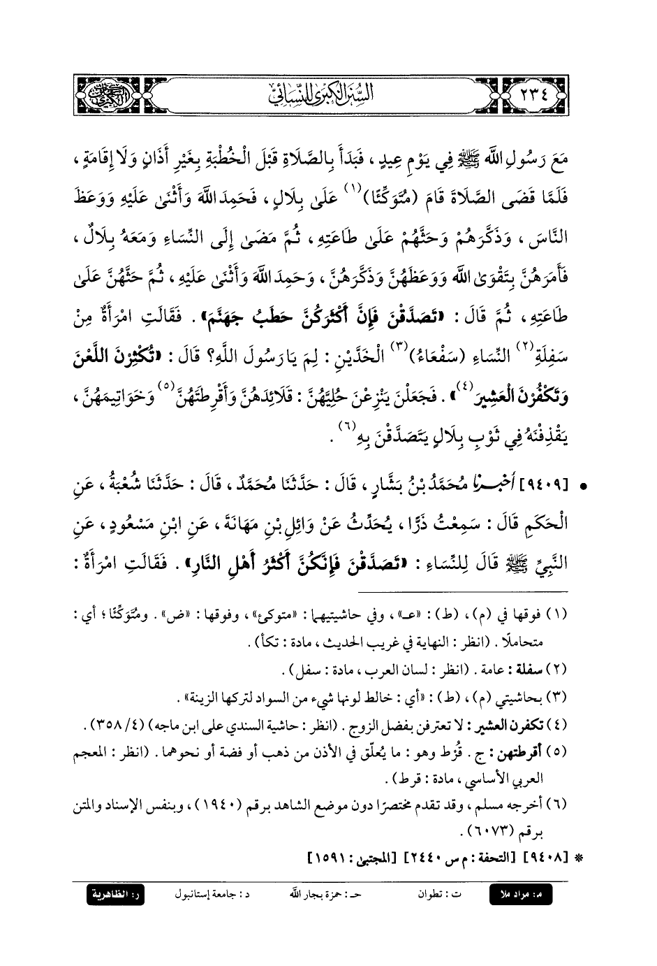 9408- أَخبَرنا عَمْرُو بنُ عَليٍّ، قَالَ: حَدثنا يَحيَى بنُ سَعِيدٍ، قَالَ: حَدثنا عَبدُ المَلِكِ بنُ أَبي سُلَيمَانَ، قَالَ: حَدثنا عَطَاءٌ، عَن جَابِرٍ قَالَ: شَهِدْتُ الصَّلاةَ مَعَ رَسُولِ اللهِ صَلى الله عَلَيهِ وسَلم فِي يَوْمِ عِيدٍ، فَبَدَأَ بِالصَّلاةِ قَبْلَ الخُطْبَةِ بِغَيْرِ أَذَانٍ وَلا إِقَامَةٍ، فَلَمَّا قَضَى الصَّلاةَ قَامَ مُتَوَكِّئًا عَلَى بِلالٍ، فَحَمِدَ اللهَ وَأَثْنَى عَلَيْهِ، وَوَعَظَ النَّاسَ، وَذَكَّرَهُمْ وَحَثَّهُمْ عَلَى طَاعَتِهِ، ثُمَّ مَضَى إِلَى النِّسَاءِ وَمَعَهُ بِلالٌ، فَأَمَرَهُنَّ بِتَقْوَى اللهِ، وَوَعَظَهُنَّ وَذَكَرَّهُنَّ، وَحَمِدَ اللهَ وَأَثْنَى عَلَيْهِ، ثُمَّ حَثَّهُنَّ عَلَى طَاعَتِهِ، ثُمَّ قَالَ: تَصَدَّقْنَ، فَإِنَّ أَكْثَرَكُنَّ حَطَبُ جَهَنَّمَ، فَقَالَتِ امْرَأَةٌ مِنْ سَفِلَةِ النِّسَاءِ سَفْعَاءُ الخَدَّيْنِ: لِمَ يَا رَسُولَ اللهِ؟ قَالَ: تُكْثِرْنَ اللَّعْنَ، وَتَكْفُرْنَ العَشِيرَ، فَجَعَلْنَ يَنْزِعْنَ حُلِيَّهُنَّ قَلائِدَهُنَّ وَأَقْرِطَتَهُنَّ وَخَوَاتِيمَهُنَّ، يَقْذِفْنَهُ فِي ثَوْبِ بِلالٍ، يَتَصَدَّقْنَ بِهِ.